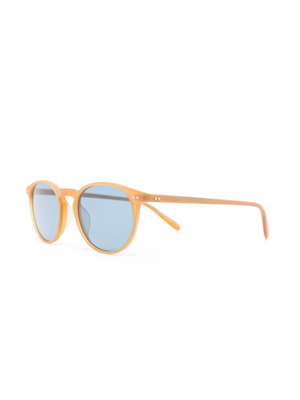 Rond montuur, gekleurde glazen, rechte pootjes en gebogen uiteinde. Materiaal: acetaat. Deze bril wordt verkocht met een beschermhoes..