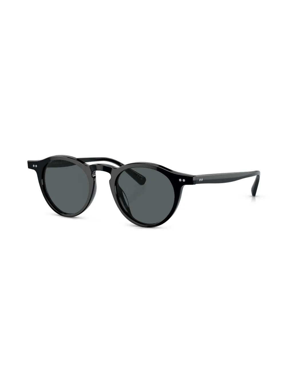 Zwart, acetaat, glanzende afwerking, grijze glazen, rond montuur, logo-reliëf aan de binnenkant en zilverkleurig materiaal.