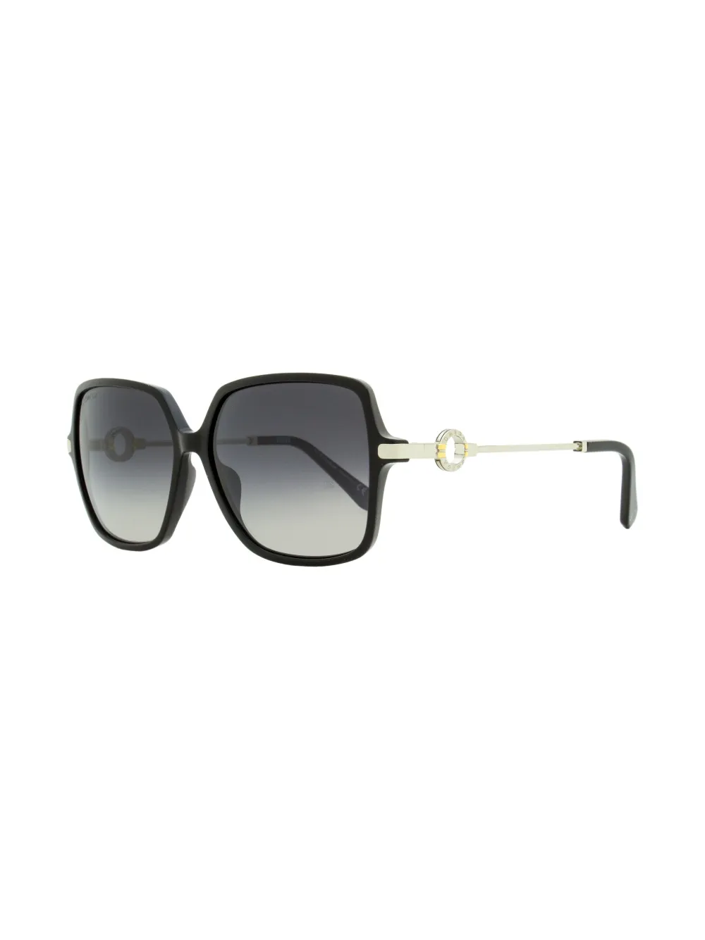 Zwart, zilverkleurig, gegraveerd detail, pootje met gegraveerd logo, gegraveerd detail, vierkant montuur, glazen met dubbel kleurverloop, geschulpte pootjes en gebogen uiteinde. Deze bril wordt verkocht met een beschermhoes..