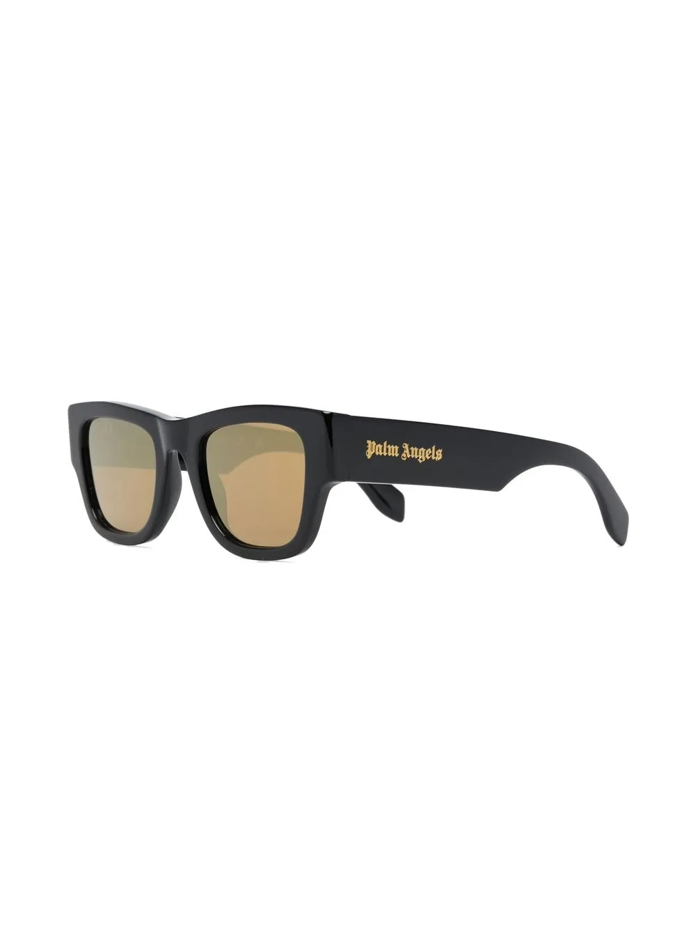 Zwart, acetaat, bruine glazen, logoprint aan de zijkant, vierkant montuur, rechte pootjes en gebogen uiteinde. Deze bril wordt verkocht met een beschermhoes..