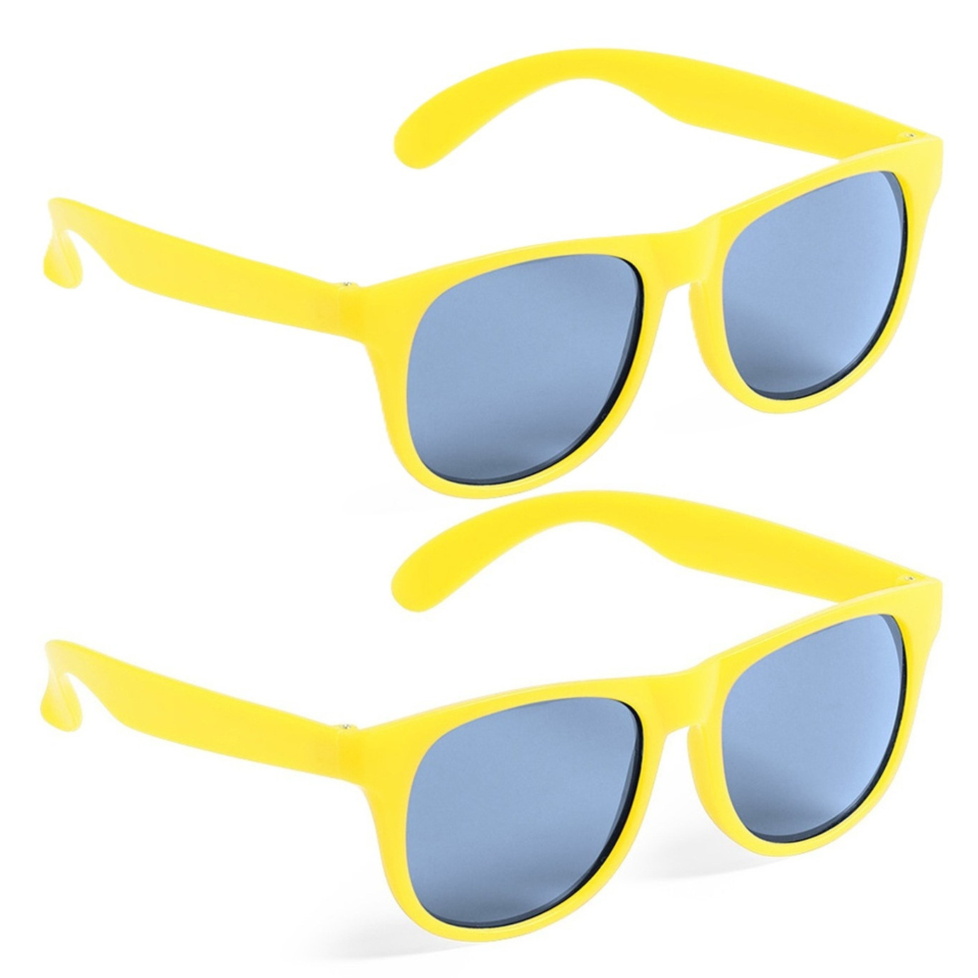 2x party zonnebril – geel – kunststof – UV400 – verkleedbril voor volwassenen. Hippe en voordelige party zonnebril met een geel montuur. Gemaakt van lichtgewicht kunststof en voorzien van UV400 bescherming tegen de zon. Ideaal als verkleedbril voor carnaval, festivals of themafeesten. Geschikt voor volwassenen.