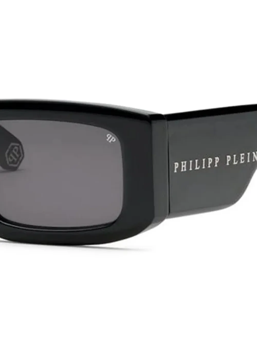 zwart rechthoekig montuur oversized pootjes logoprint op het pootje grijze glazen