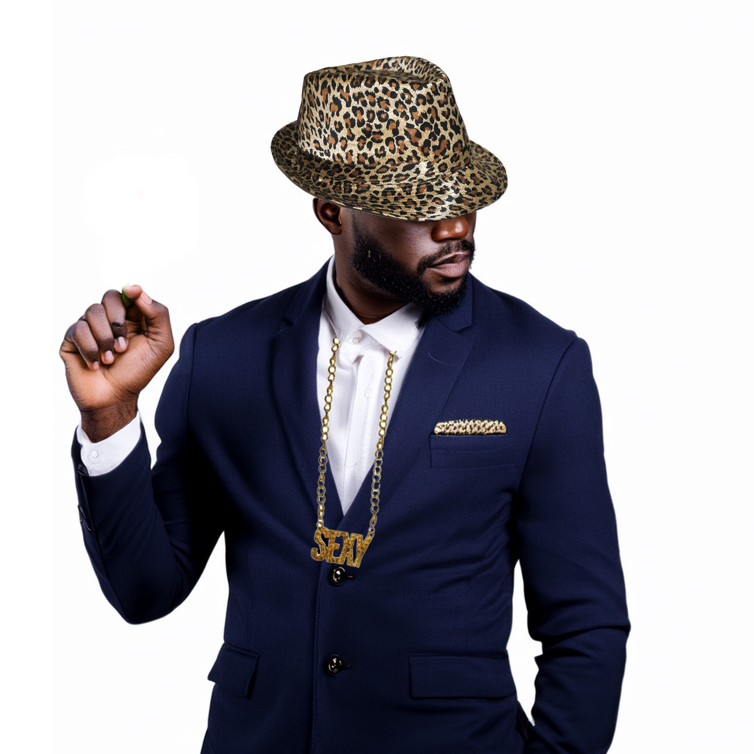 Pimp/pooier foute party verkleed set voor heren. Een 2 delige accessoires set bestaande uit een panter print pet, en een gouden schakelketting met tekst Sexy. Je kan verder je gewone zwarte kleding zoals overhemd en pantalon gebruiken, maar leuker is een bijpassend verkleedkleding kostuum of verkleed thema t-shirt. Deze kunt u ook in onze shop vinden. , Dit artikel bestaat uit:, 1x Gouden verkleed schakelketting Sexy – Carnaval accessoires Pimp/Foute party thema, 1x Trilby carnaval verkleed hoedje – met luipaard print – Verkleedkleding hoeden