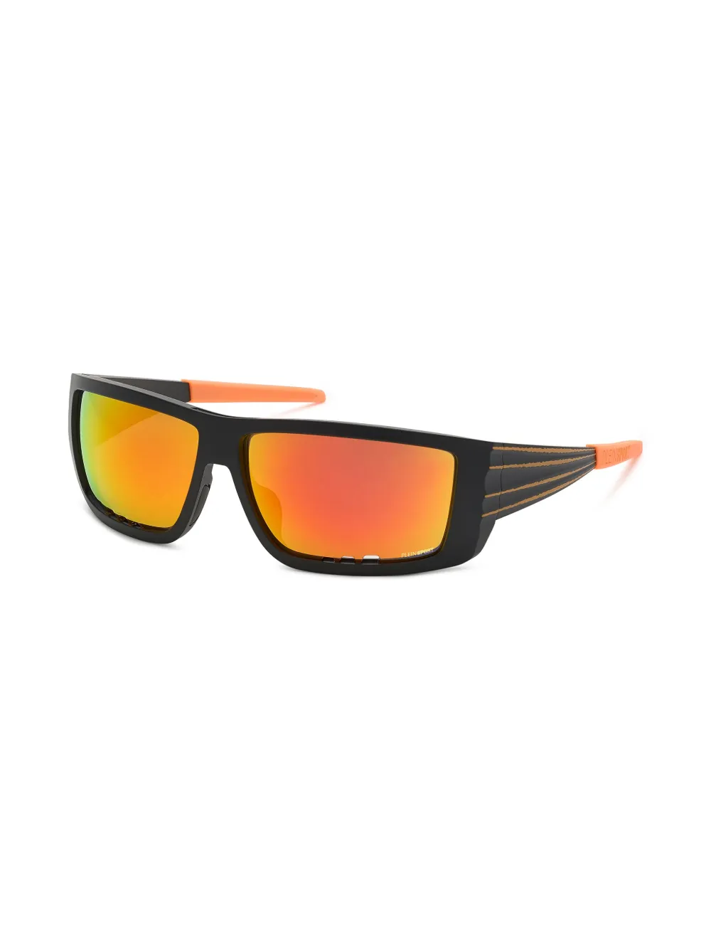 zwart/oranje zijstreep uitgesneden detail rechthoekig montuur glazen met kleurverloop glazen met UV-bescherming verhoogde neusbrug neuskussentjes contrasterende rechte poten Deze bril wordt verkocht met een beschermhoes.