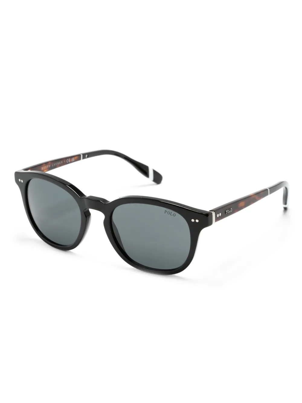zwart acetaat glanzende afwerking schildpadschild effect logoplakkaat op de mouw gekleurde glazen rond montuur rechte pootjes gebogen uiteinde Deze bril wordt verkocht met een beschermhoes.