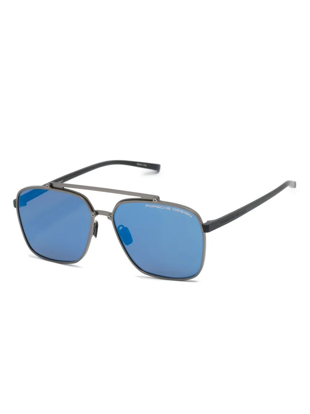 donkergrijs titanium vierkant montuur blauwe glazen gespiegelde glazen glazen met UV-bescherming lens sticker dubbele neusbrug neuskussentjes rechte pootjes gebogen uiteinden Deze bril wordt verkocht met een beschermhoes.