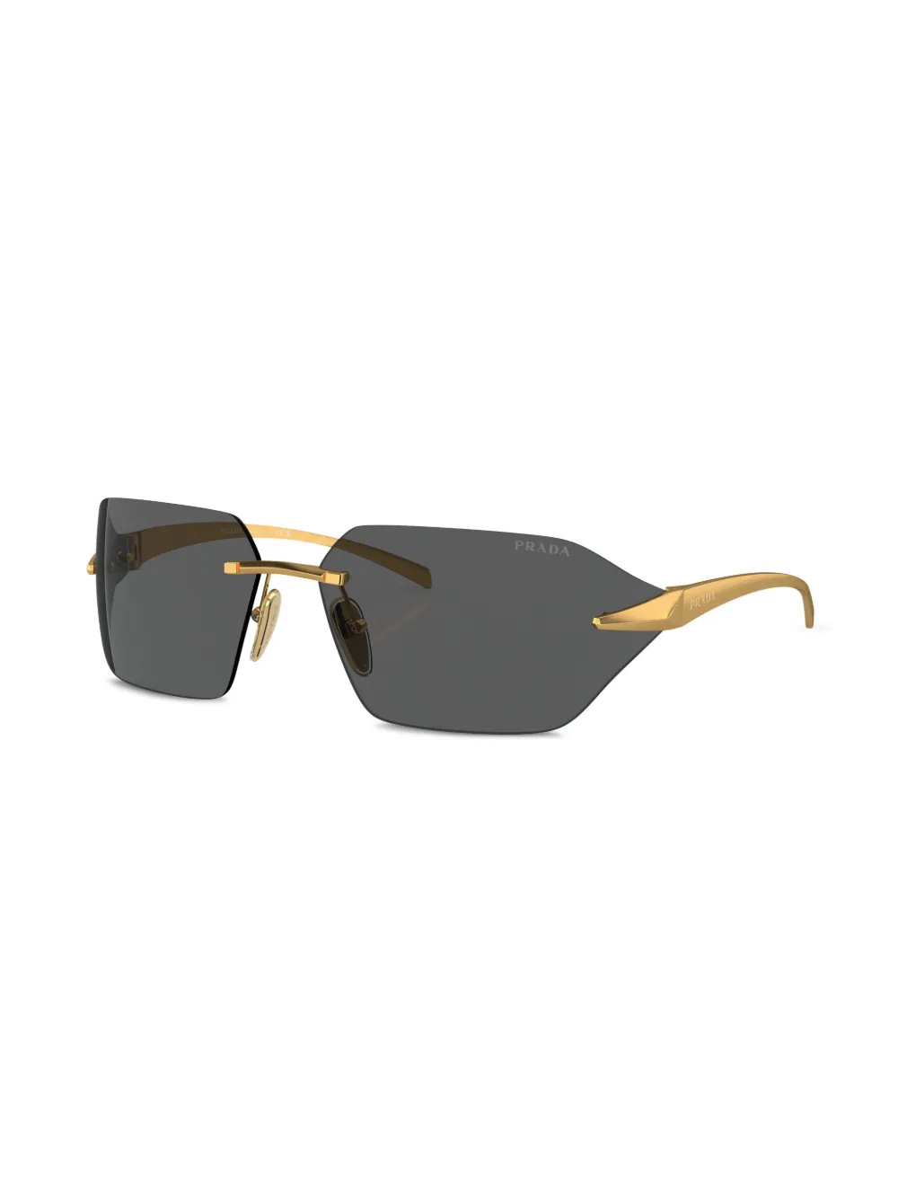Goudkleurig, metaal, grijze glazen, frameloos design, neuskussentjes, pootje met gegraveerd logo en gewelfde pootjes. Deze bril wordt verkocht met een beschermhoes..