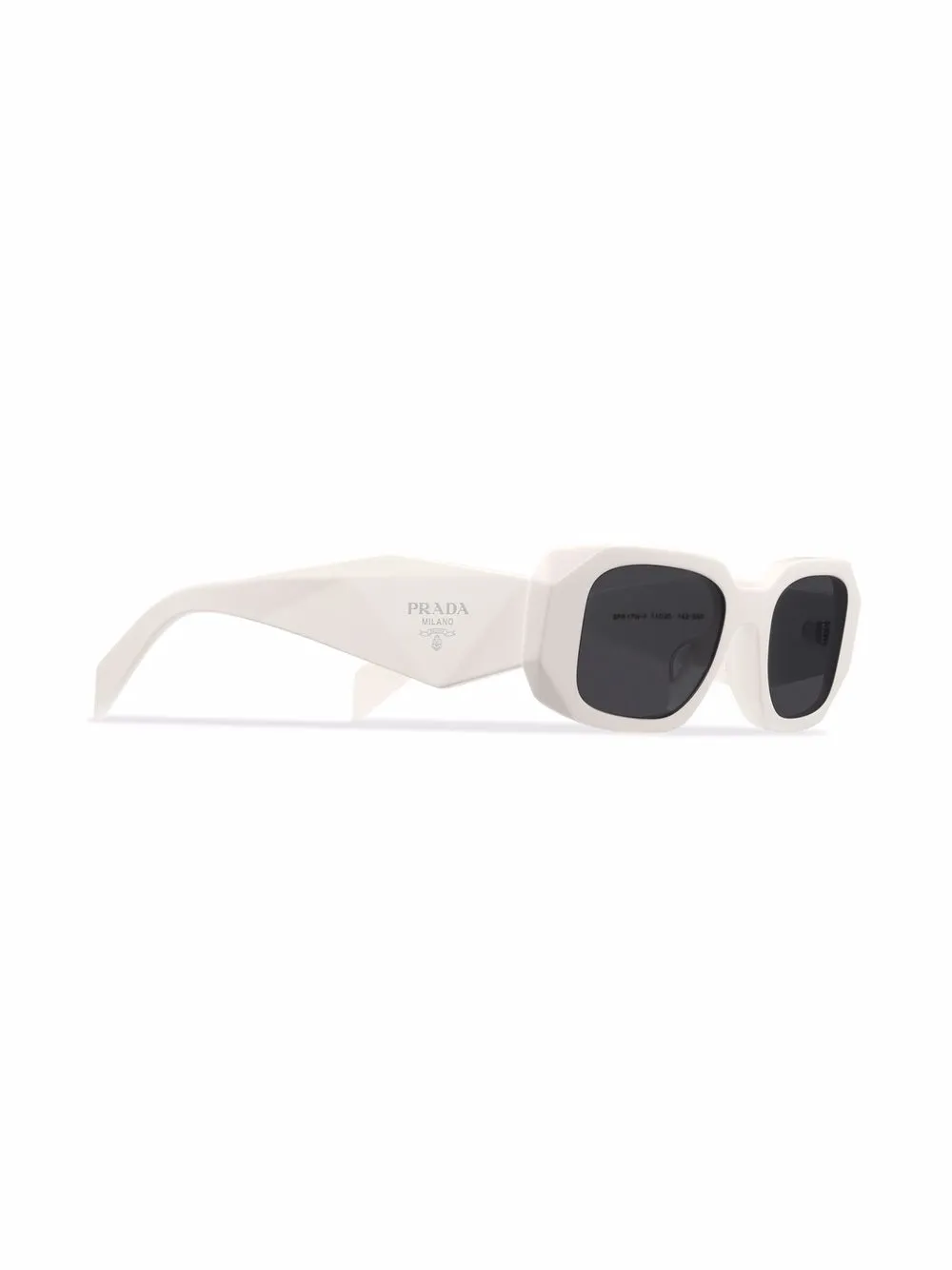 Rechthoekig montuur, gekleurde glazen, neuskussentjes, logoprint op het pootje en gebogen uiteinde. Deze bril wordt verkocht met een beschermhoes..