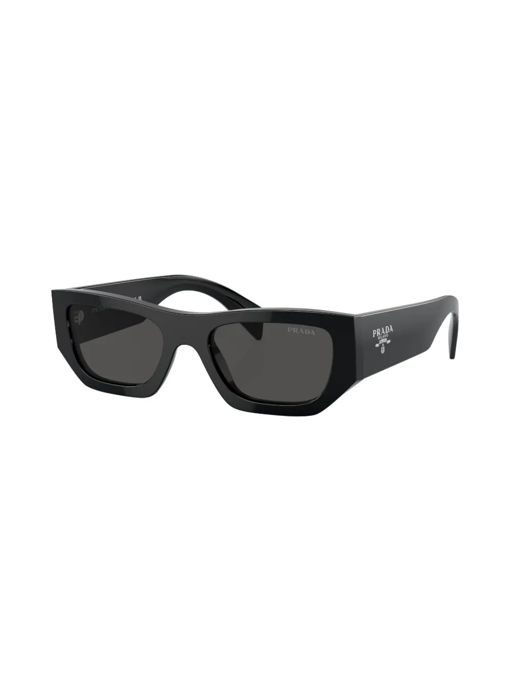 Zwart, acetaat, logo, geometrisch montuur, grijze glazen, oversized pootjes en gebogen uiteinde. Deze bril wordt verkocht met een beschermhoes..