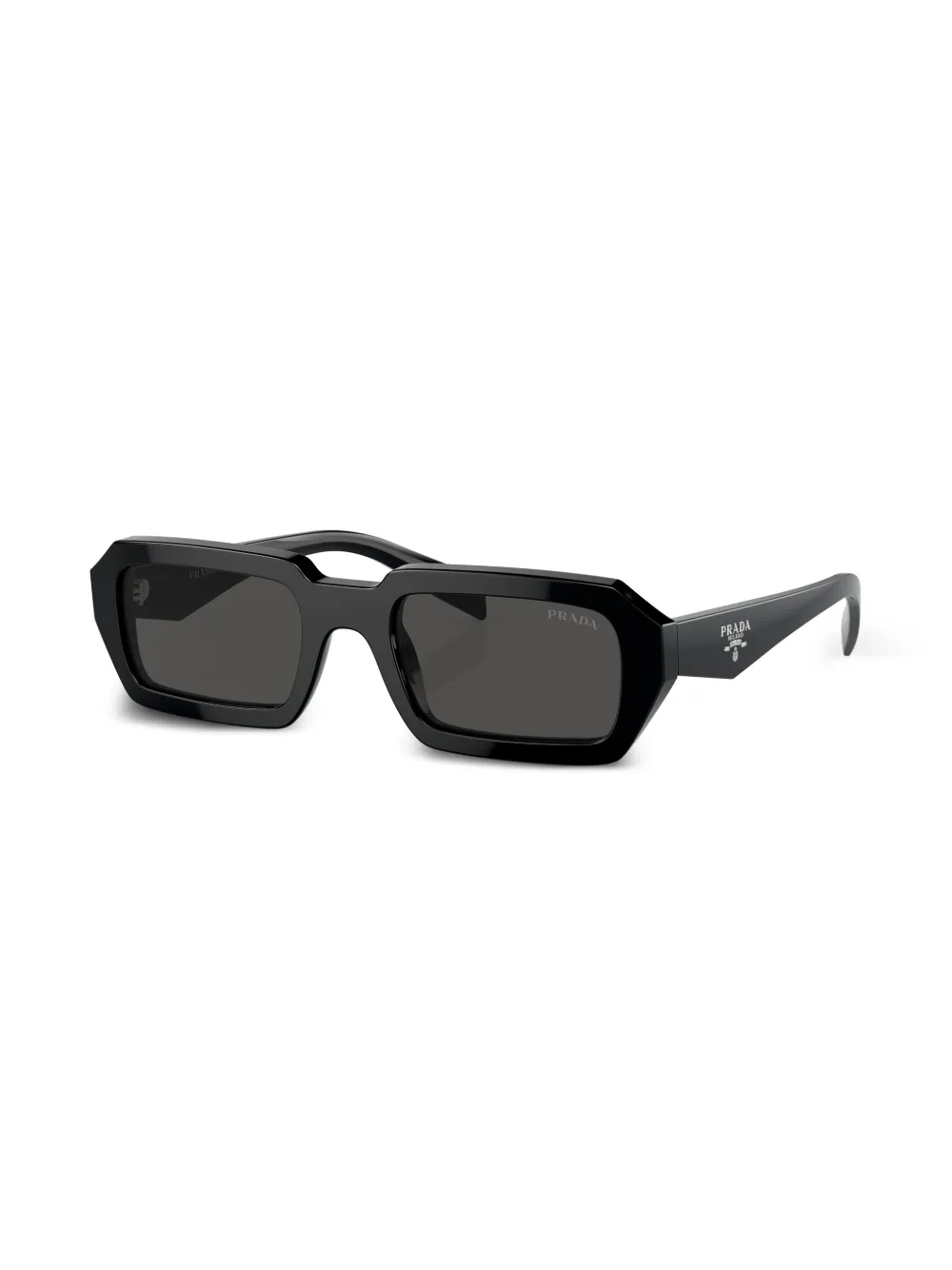 Zwart, acetaat, zilverkleurig logo, rechthoekig montuur, grijze glazen, rechte pootjes en gebogen uiteinde. Deze bril wordt verkocht met een beschermhoes..