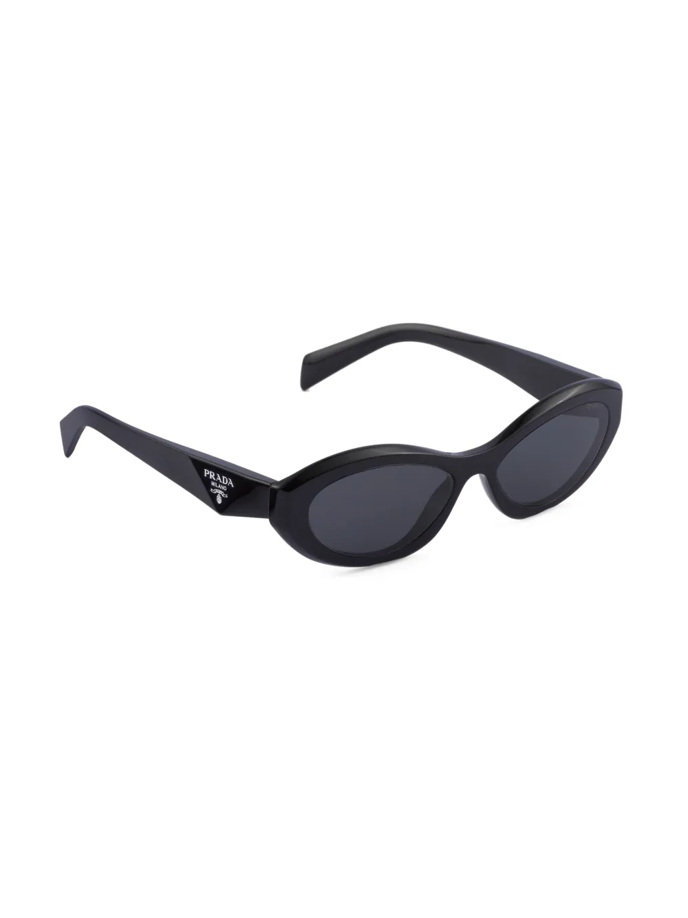 Zwart, acetaat, ovaal montuur, grijze glazen, logoprint op het pootje, geschulpte pootjes en gebogen uiteinde. Deze bril wordt verkocht met een beschermhoes.. .