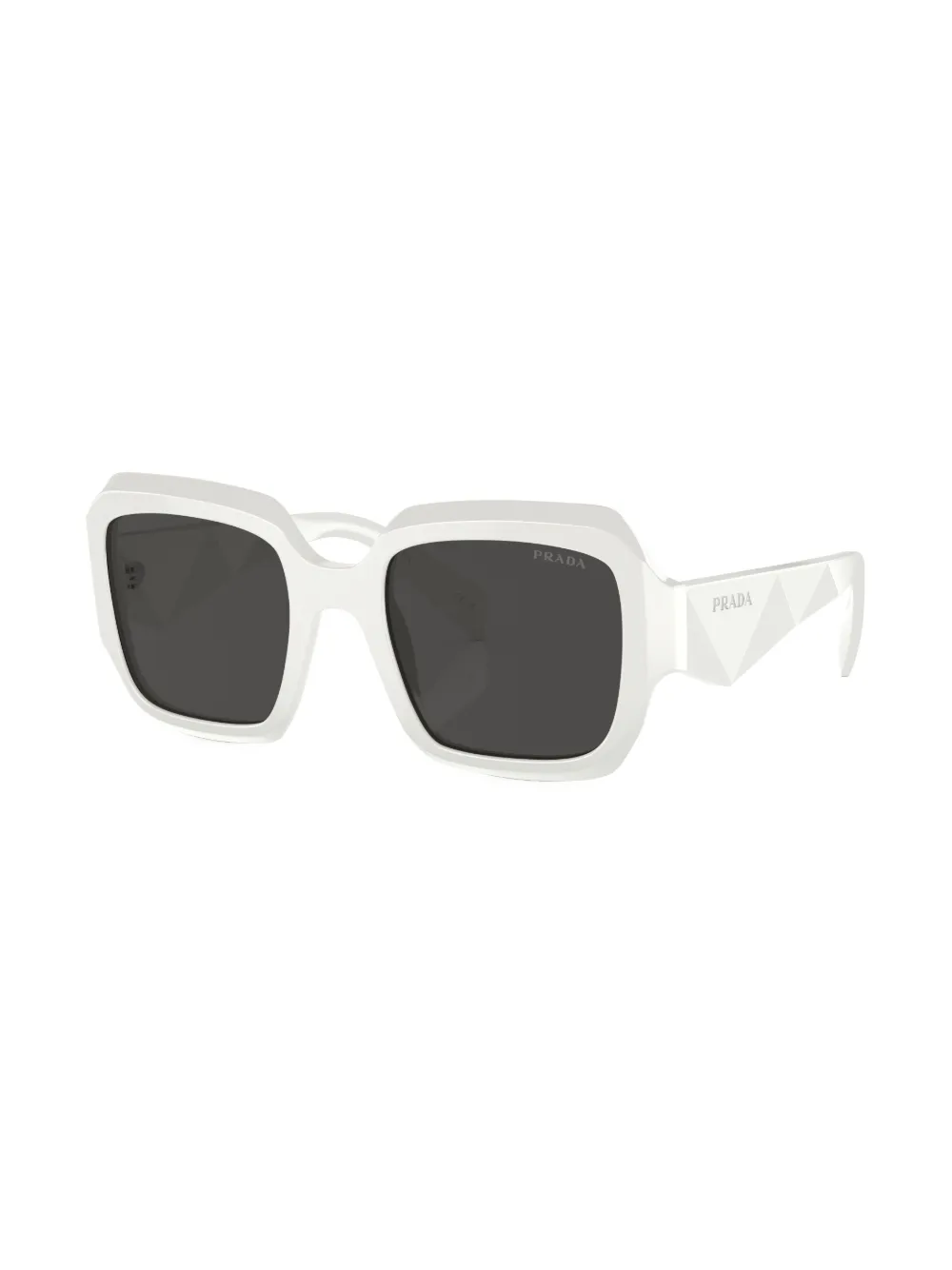 Wit, acetaat, grijze glazen, oversized montuur, pootje met gegraveerd logo, geschulpte pootjes en gebogen uiteinde. Deze bril wordt verkocht met een beschermhoes..