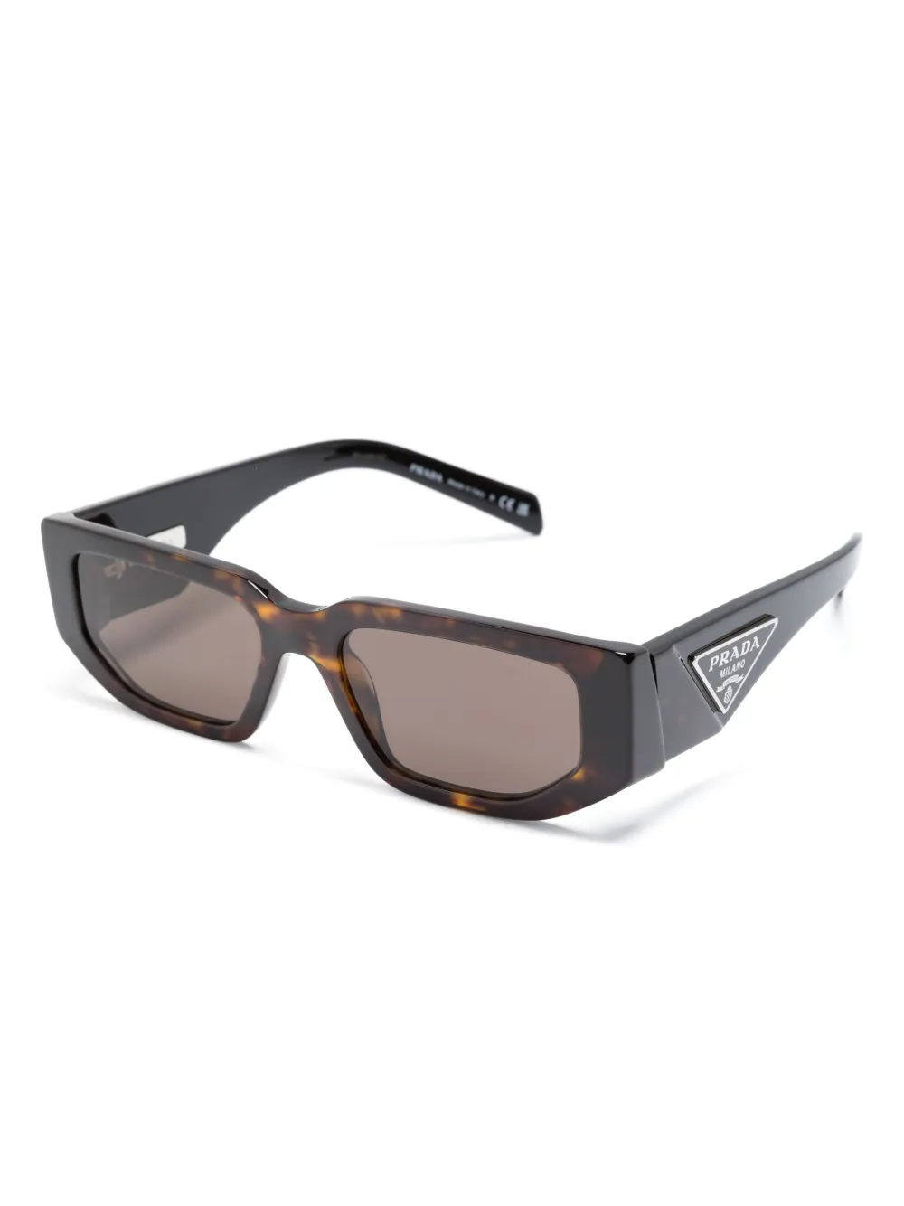Havana bruin, acetaat, schildpad montuur, rechthoekig montuur, bruine glazen, driehoekig logo, gewelfde pootjes en gebogen uiteinde. Deze bril wordt verkocht met een beschermhoes..