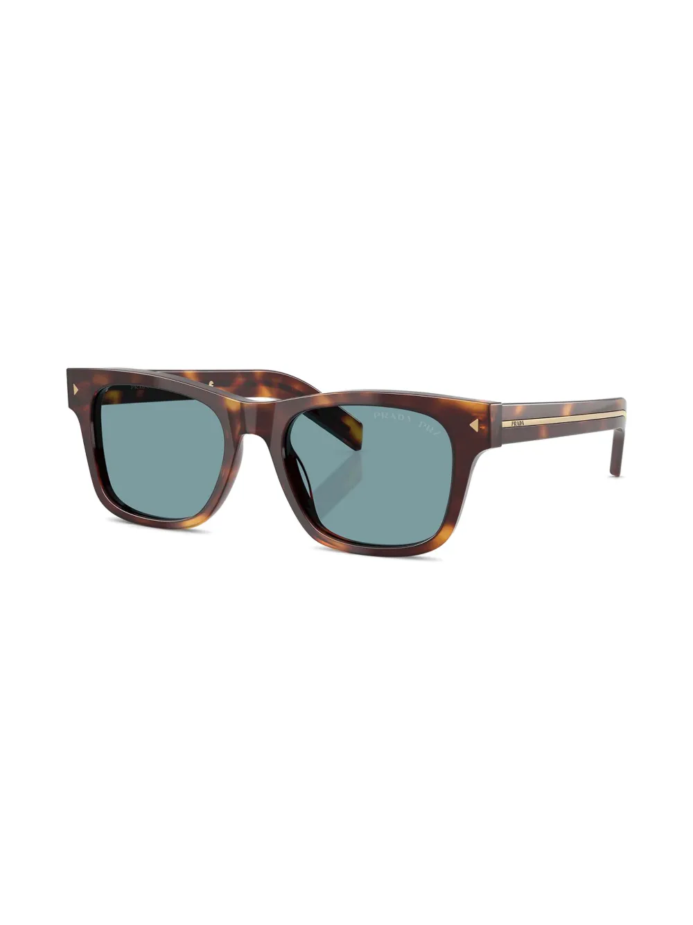 Havana bruin acetaat vierkant montuur blauwe glazen schildpad montuur klinknageldetails gegraveerd logo rechte pootjes gebogen uiteinden Deze bril wordt verkocht met een beschermhoes.