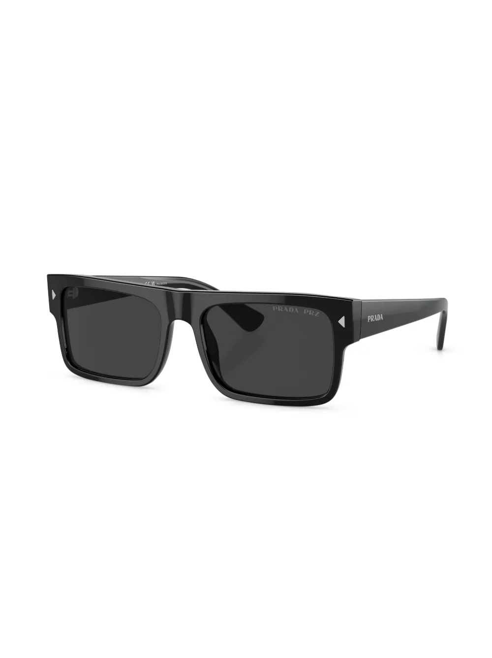 Zwart, acetaat, zilverkleurig logo, vierkant montuur, grijze glazen, rechte pootjes en gebogen uiteinde. Deze bril wordt verkocht met een beschermhoes..