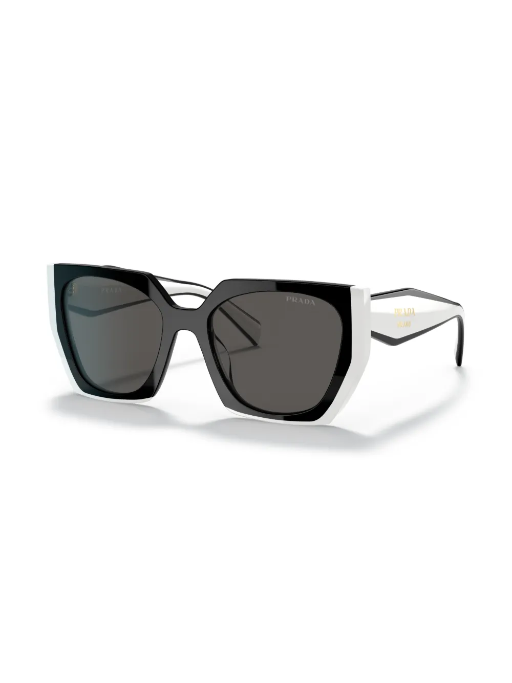 zwart/wit acetaat vlindermontuur grijze glazen glazen met UV-bescherming gegraveerd logo logoprint op de brillenpoot geschulpte pootjes gebogen uiteinden Deze bril wordt verkocht met een beschermhoes.