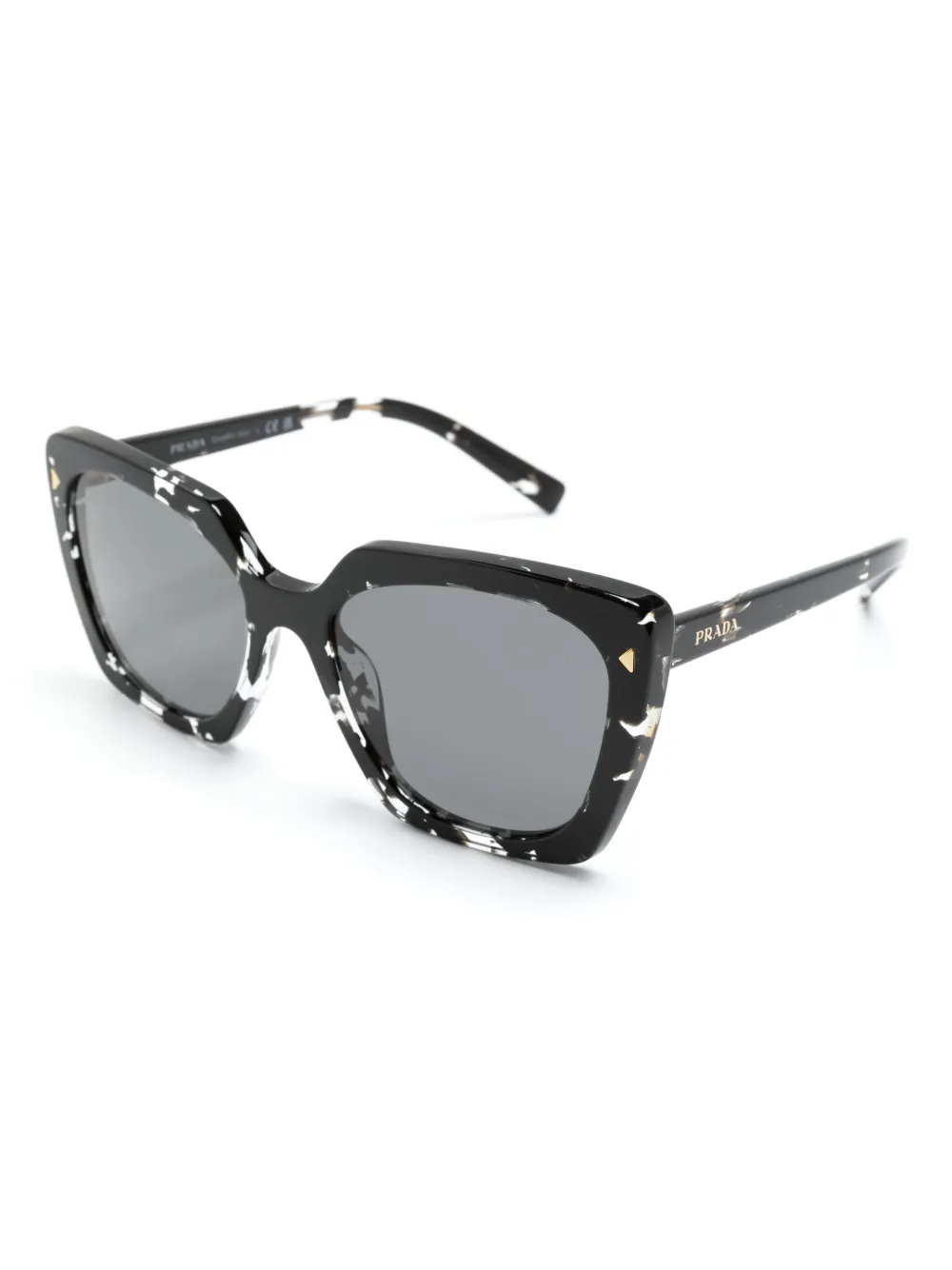 zwart acetaat schildpad montuur vlindermontuur grijze glazen goudkleurig logo rechte poten met gebogen uiteinden Deze bril wordt verkocht met een beschermhoes.