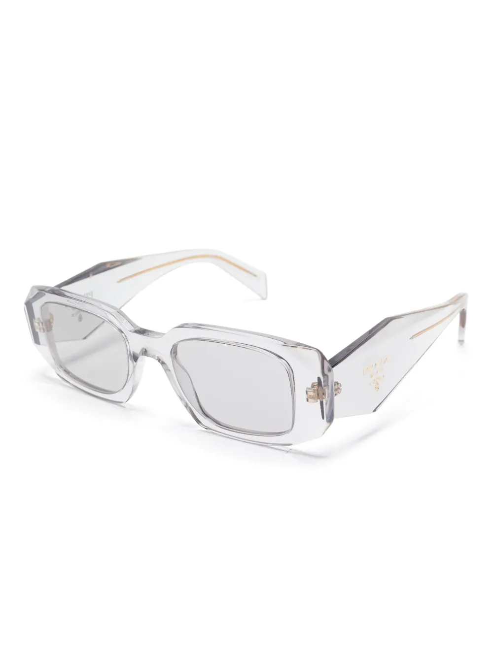 lichtgrijs doorzichtig design rechthoekig montuur grijze glazen glazen met UV-bescherming logo lens sticker pootje met gegraveerd logo driehoekig logo op de poten bewerkte poten met gewelfde uiteinden Deze bril wordt verkocht met een beschermhoes. Staat: UITSTEKEND. Dit item, dat eerder in iemands bezit is geweest, is in bijna perfecte staat zonder sporen van schade of gebruik.