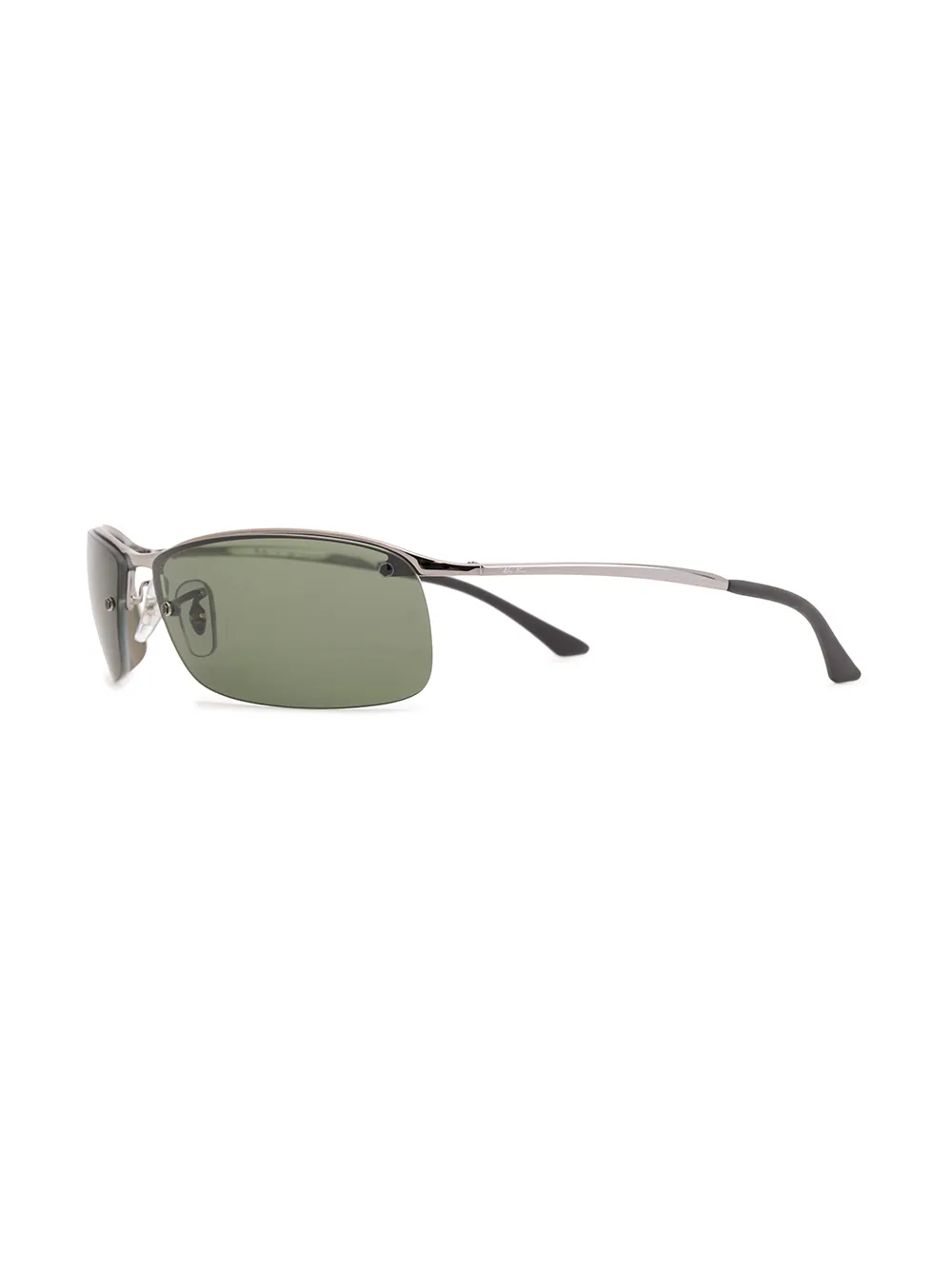 BB3183S zonnebril met rechthoekig montuur van Ray Ban uitgevoerd in metaal voorzien van logo-afbeelding op lens, neuskussentjes, donker getinte glazen en gestrekte armen met gebogen uiteinden. Het artikel is inclusief beschermende hoes.