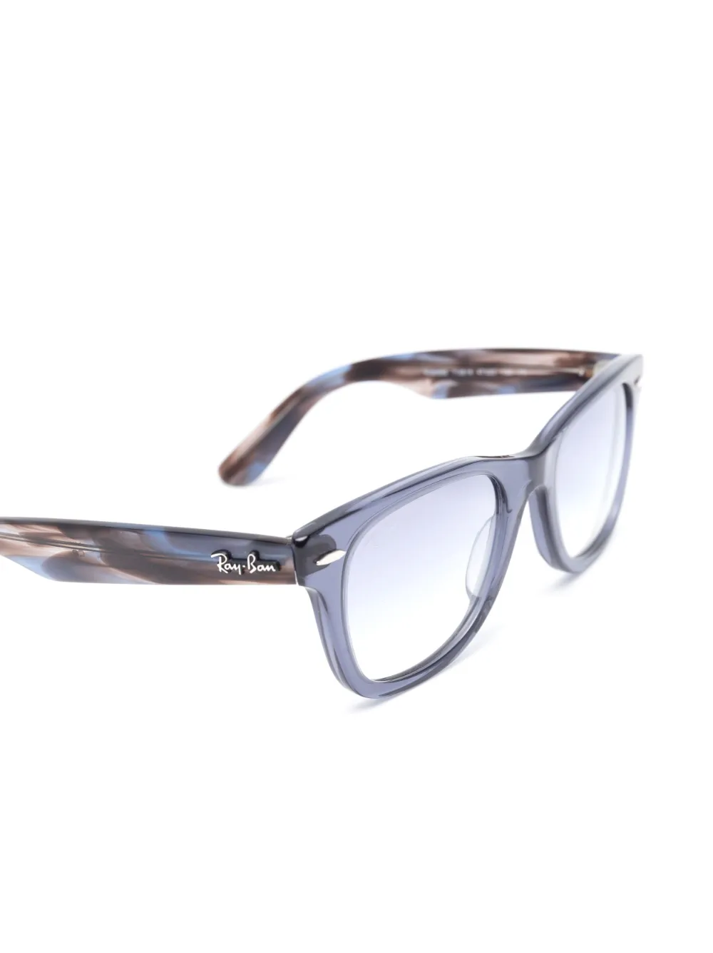 Hemelsblauw, acetaat, schildpad montuur, glazen met kleurverloop, vierkant montuur, rechte pootjes en gebogen uiteinde. Deze bril wordt verkocht met een beschermhoes..