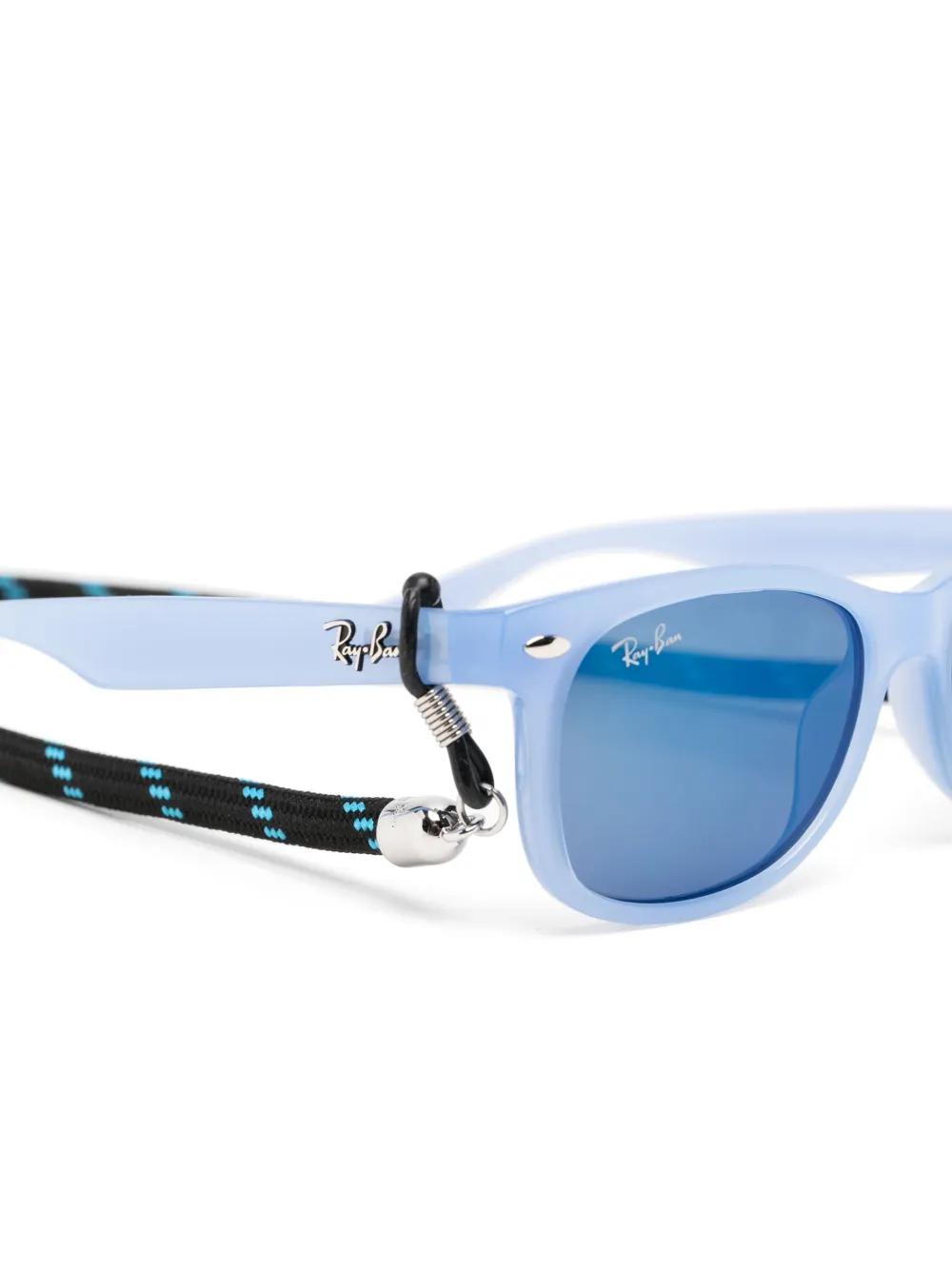 Alice blauw, acetaat, doorzichtig design, Wayfarer montuur, blauwe glazen, logoplakkaat op het pootje, glazen met UV-bescherming, geschulpte pootjes, gebogen uiteinde en slingback bandje. Deze bril wordt verkocht met een beschermhoes..