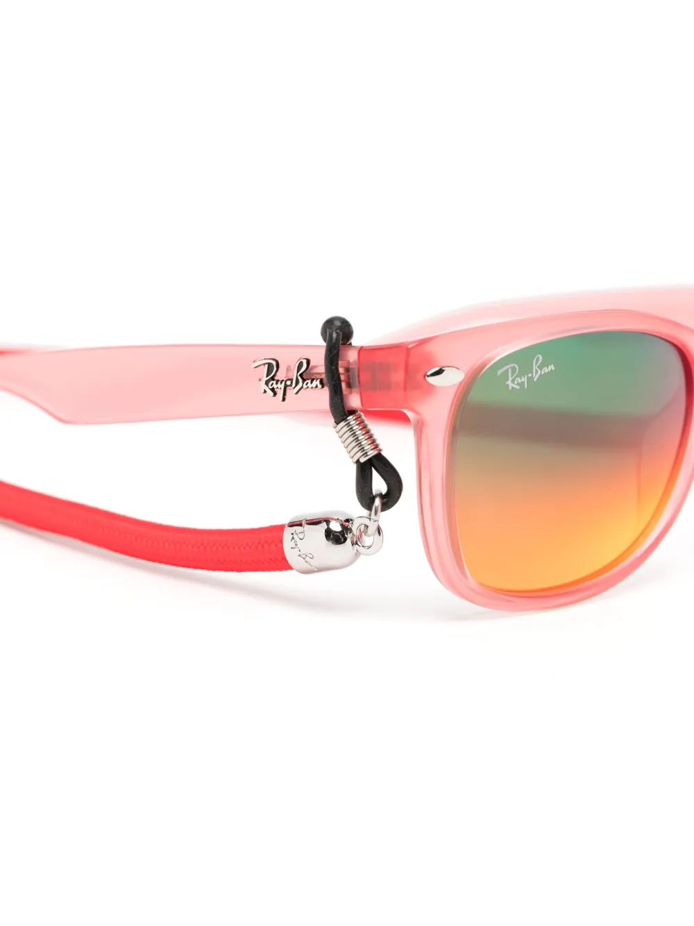 Helderrood, doorzichtig design, Wayfarer montuur, gespiegelde glazen, logoplakkaat op het pootje, glazen met UV-bescherming, geschulpte pootjes, gebogen uiteinde en slingback bandje. Deze bril wordt verkocht met een beschermhoes..
