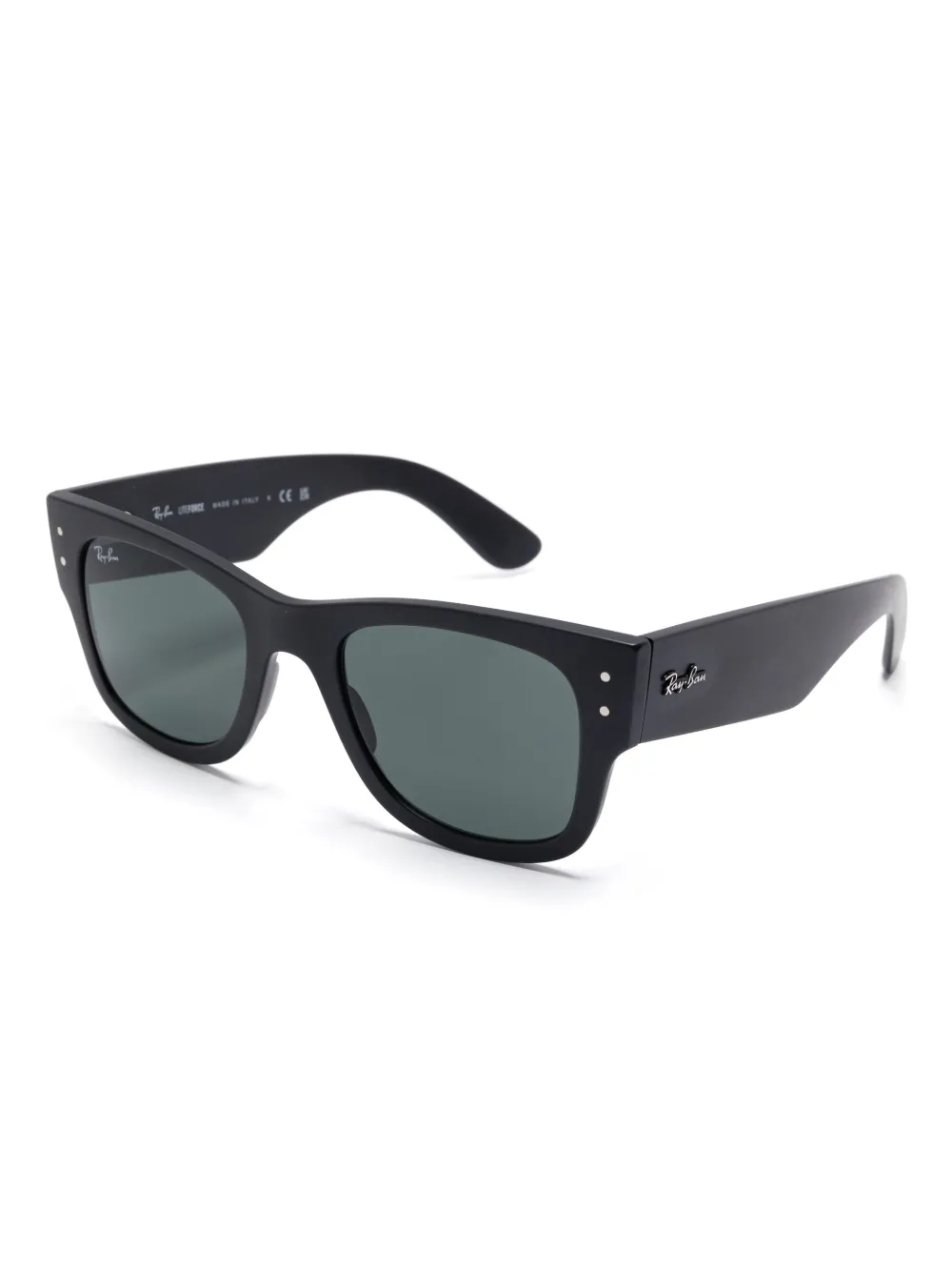 zwart matte-effect Wayfarer montuur groen getinte glazen logo lens sticker gewelfde pootjes logoplakkaat op het pootje gebogen uiteinden Deze bril wordt verkocht met een beschermhoes.