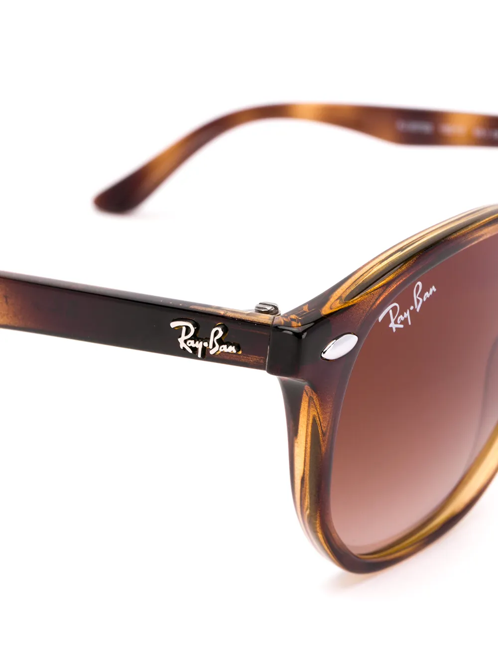 Wayfarer zonnebril met rond montuur van Ray-Ban Junior voorzien van gekleurde glazen, geprint logo aan voorzijde, logo aan de buitenkant van de armen en gestrekte armen met gebogen uiteinden. Het artikel is inclusief beschermende hoes.