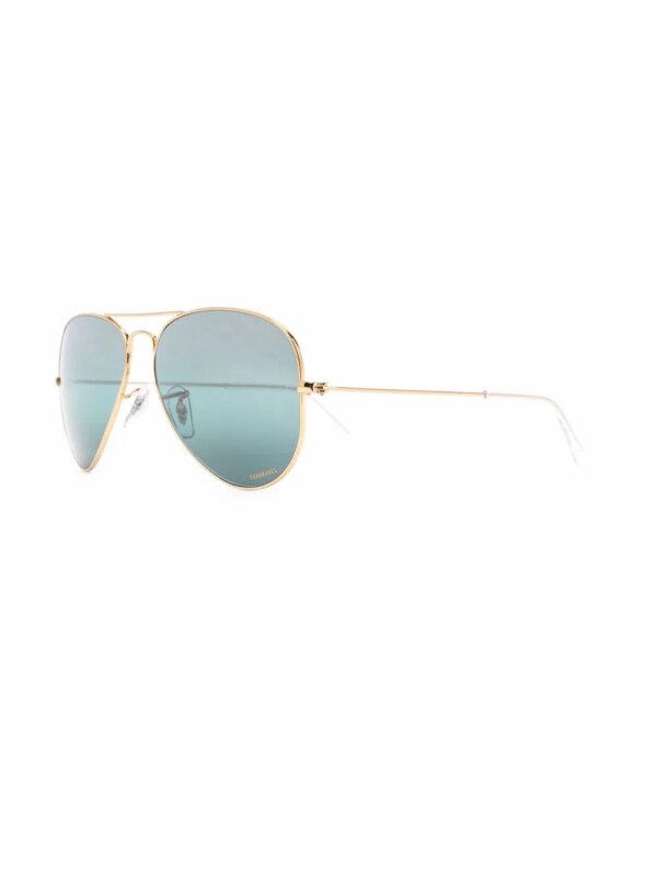 Aviator montuur, blauwe glazen, goudkleurig materiaal, rechte pootjes en gebogen uiteinde. Deze bril wordt verkocht met een beschermhoes..