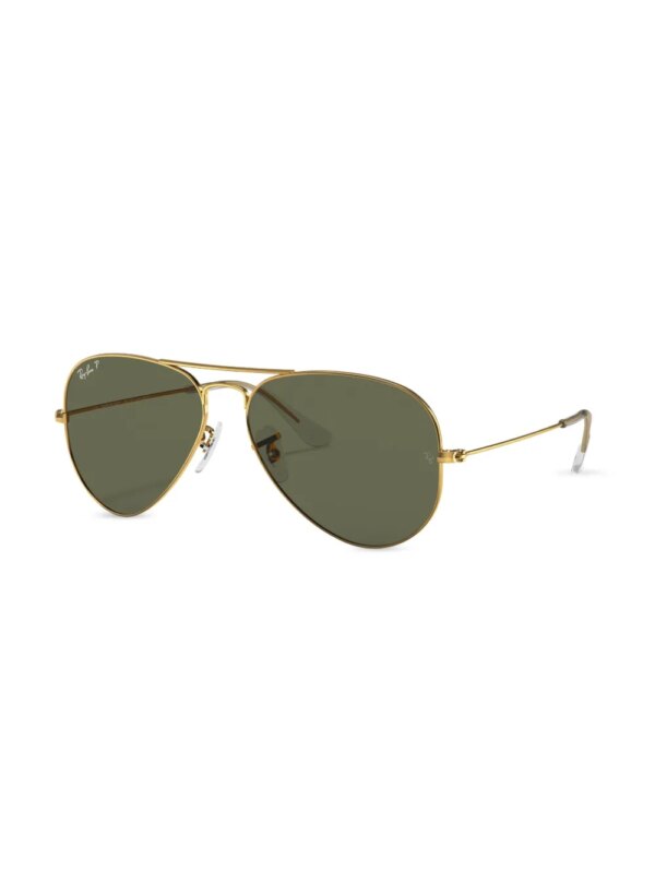 Zonnebril met piloten montuur van Ray Ban uitgevoerd in metaal voorzien van donker getinte glazen, smalle bovenste balk en gestrekte armen met hoekig uiteinde. Het artikel is inclusief beschermende hoes.