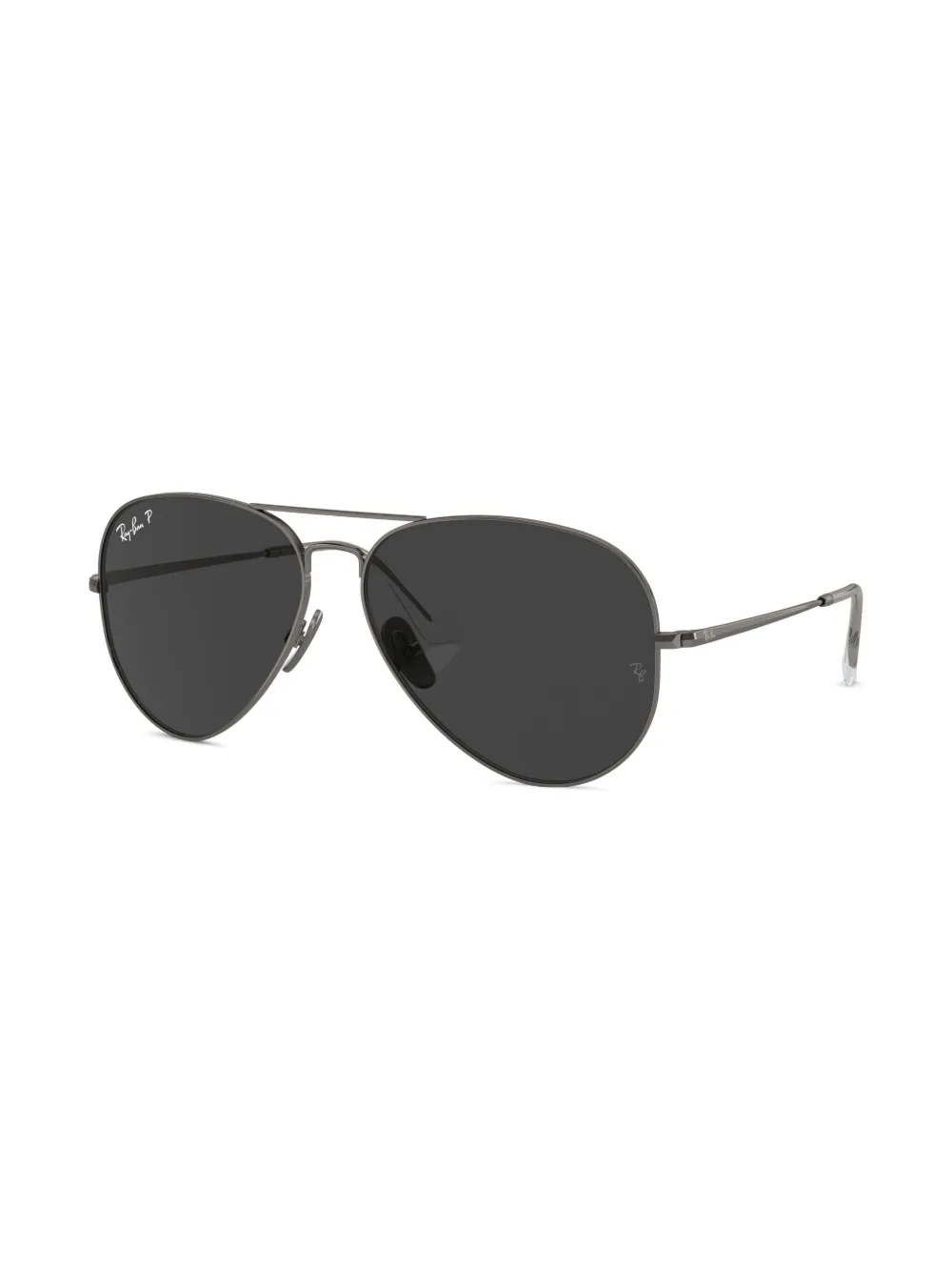 zwart titanium grijze glazen UV-bescherming logoprint op de voorkant kenmerkend Ray-Ban Aviator montuur verhoogde neusbrug neuskussentjes rechte pootjes gebogen uiteinden Deze bril wordt verkocht met een beschermhoes.