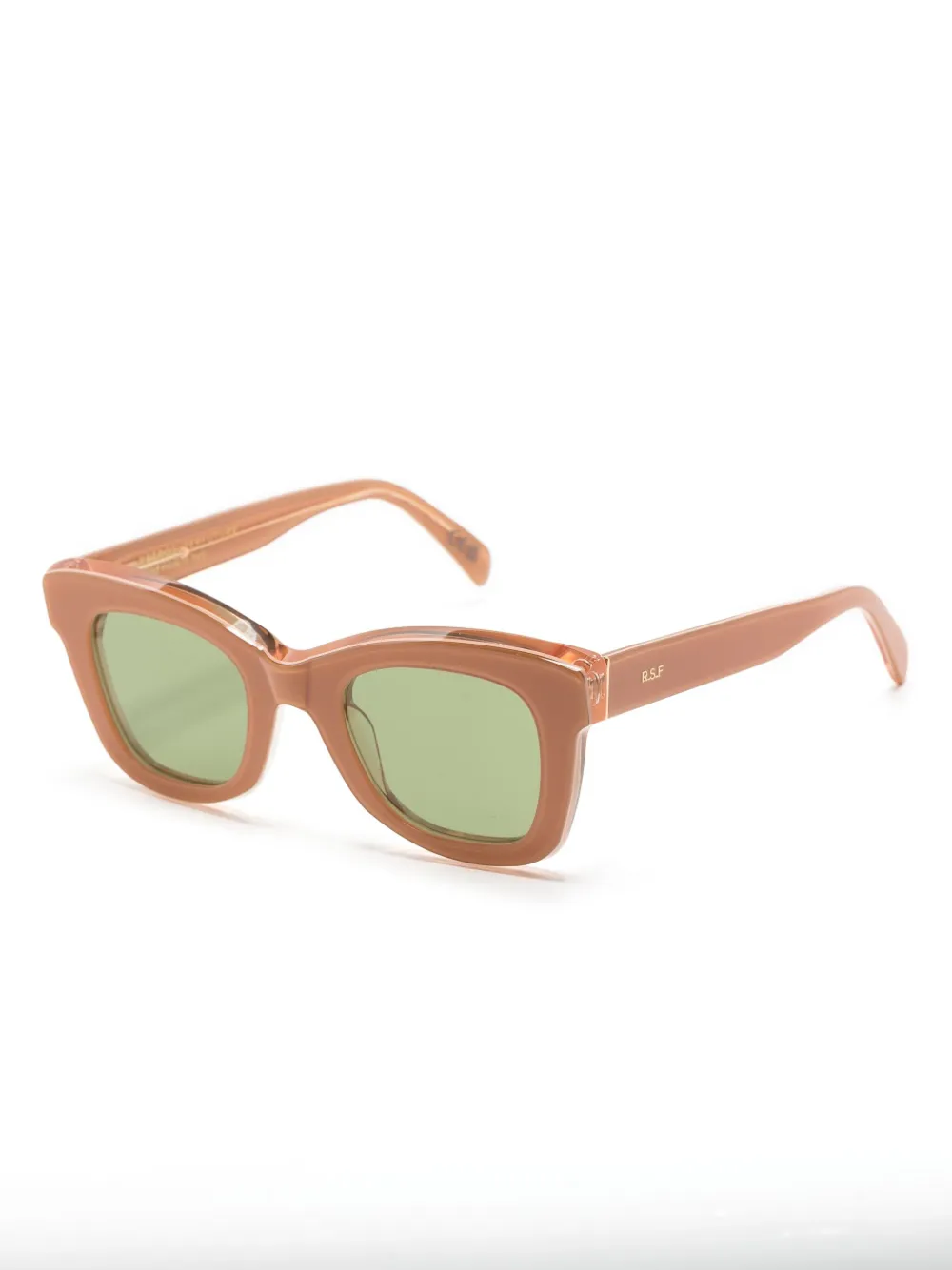 licht roze acetaat vierkant montuur groengetinte glazen glazen met UV-bescherming schildpad montuur goudkleurig materiaal logo bedrukt pootje rechte pootjes gebogen uiteinden Deze bril wordt verkocht met een beschermhoes.