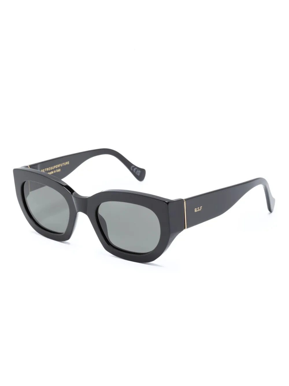 Gitzwart, acetaat, goudkleurig materiaal, pootje met gegraveerd logo, rechthoekig montuur, gekleurde glazen, rechte pootjes en gebogen uiteinde. Deze bril wordt verkocht met een beschermhoes..
