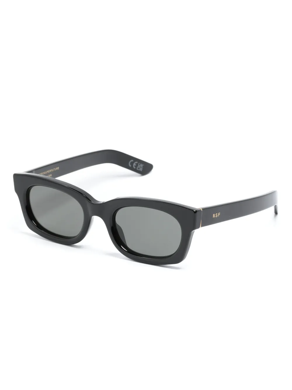 zwart acetaat vierkant montuur grijze glazen pootjes met gegraveerd logo rechte poten met gebogen uiteinden Deze bril wordt verkocht met een beschermhoes.