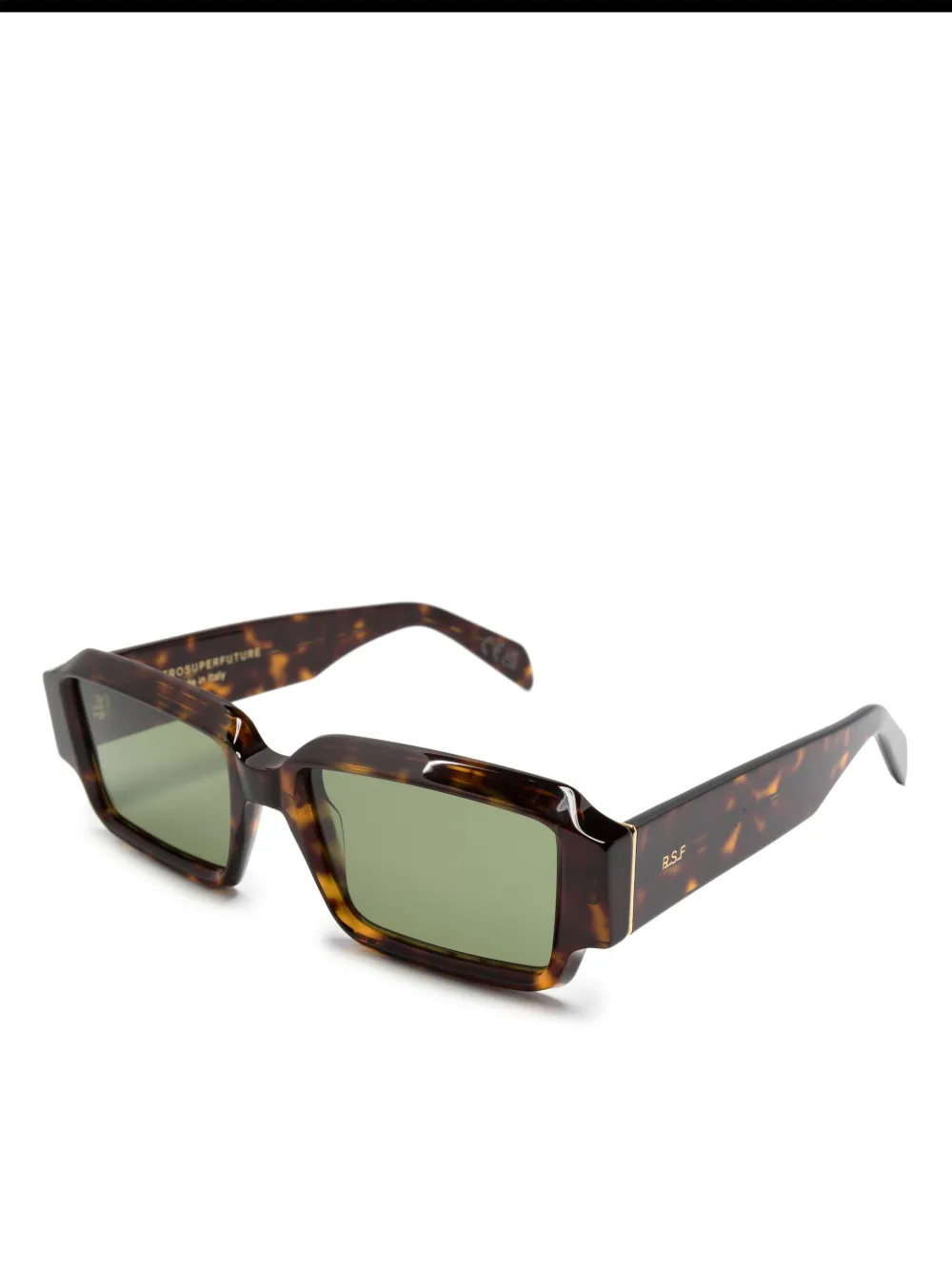Havana bruin, acetaat, schildpad montuur, rechthoekig montuur, groengetinte glazen, logoprint op het pootje, oversized pootjes en gebogen uiteinde. Deze bril wordt verkocht met een beschermhoes..