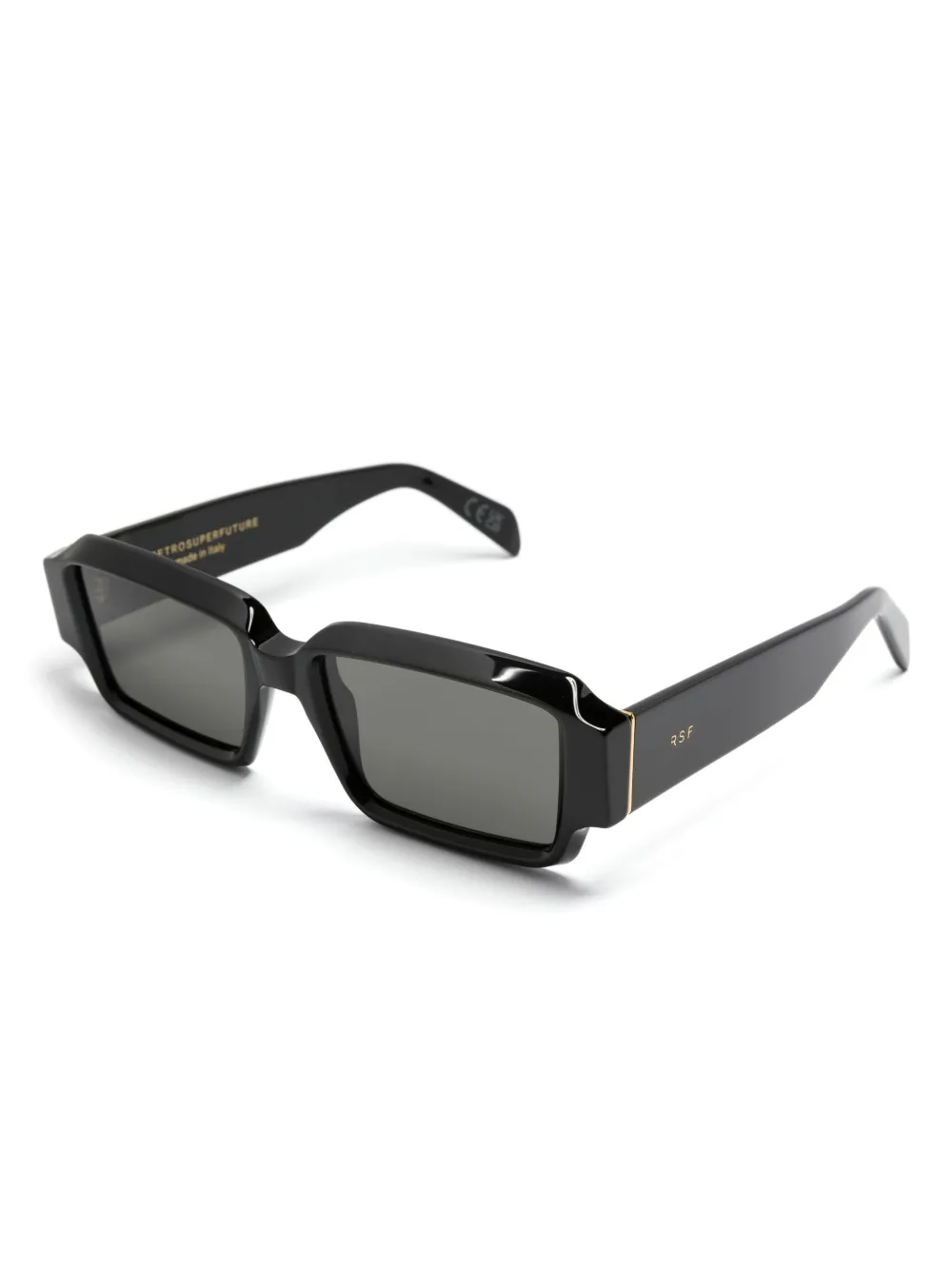 Zwart, acetaat, rechthoekig montuur, grijze glazen, logoprint op het pootje, oversized pootjes en gebogen uiteinde. Deze bril wordt verkocht met een beschermhoes..