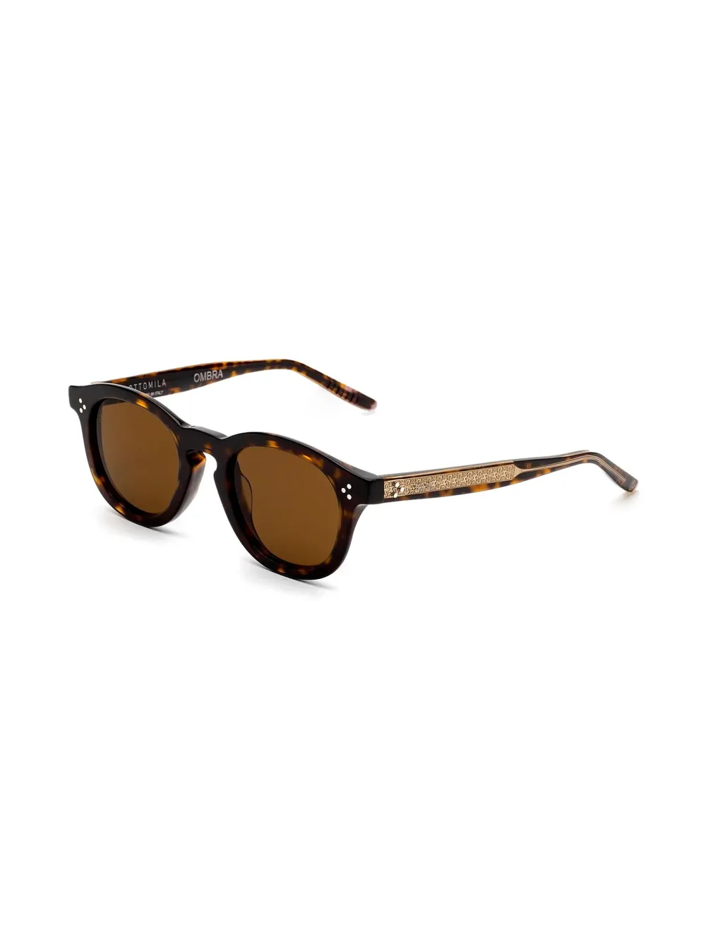 tabakbruin acetaat schildpad montuur gekleurde glazen rond montuur gegraveerd detail rechte pootjes gebogen uiteinden Deze bril wordt verkocht met een beschermhoes.