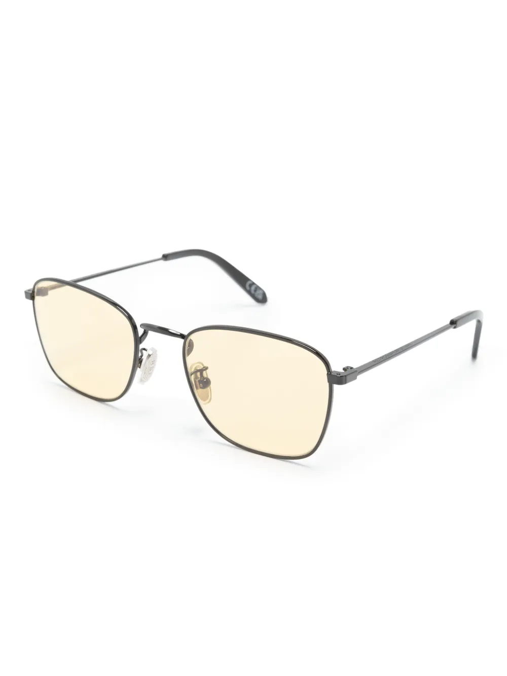 zwart metaal vierkant montuur gele glazen glazen met UV-bescherming neuskussentjes pootjes met gegraveerd logo rechte pootjes gebogen uiteinden Deze bril wordt verkocht met een beschermhoes.