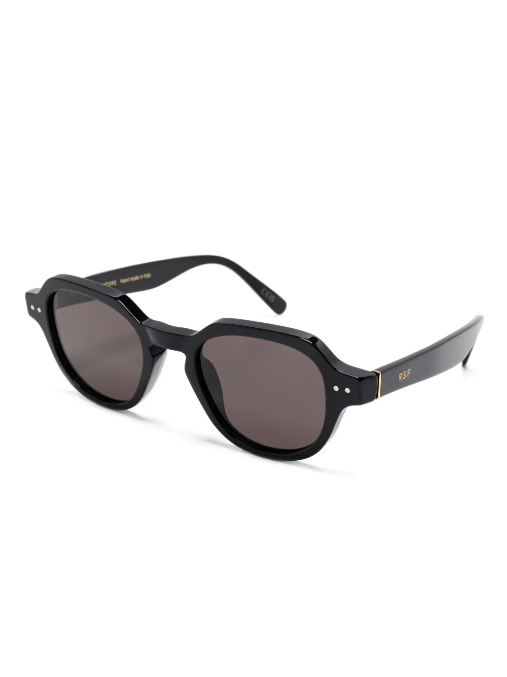 zwart geometrisch montuur grijze glazen logoprint op het pootje rechte pootjes gebogen uiteinden Deze bril wordt verkocht met een beschermhoes.