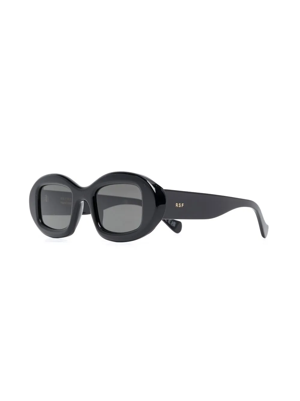 Zwart, grijze glazen, acetaat, logoprint op het pootje, ovaal montuur, logoprint op de voorkant en kussenvormige horlogekast.