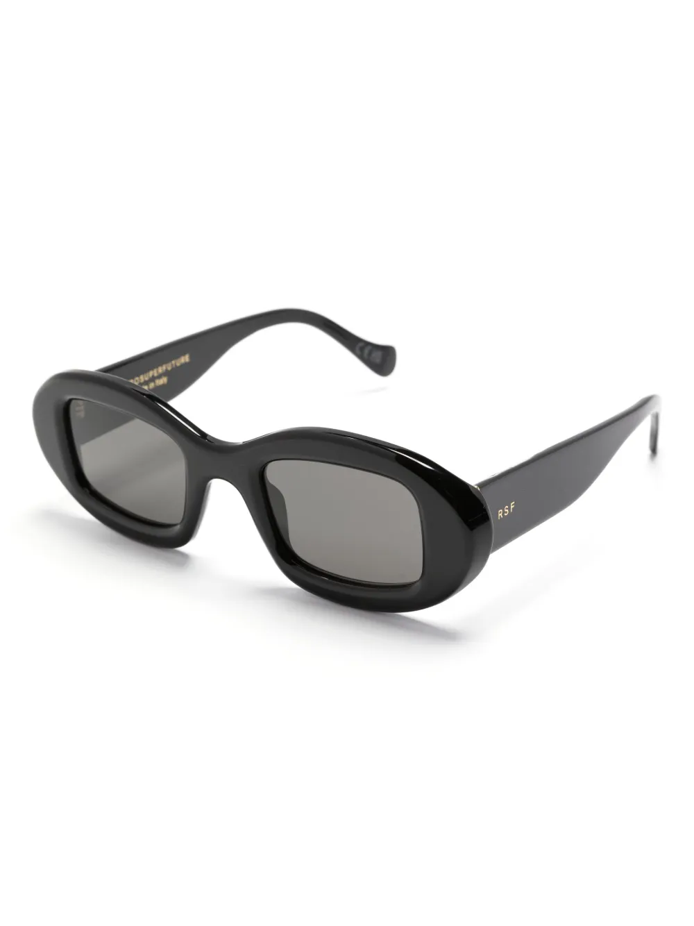 Gitzwart, acetaat, grijze glazen, ovaal montuur, logoprint op het pootje, rechte pootjes en gebogen uiteinde. Deze bril wordt verkocht met een beschermhoes..