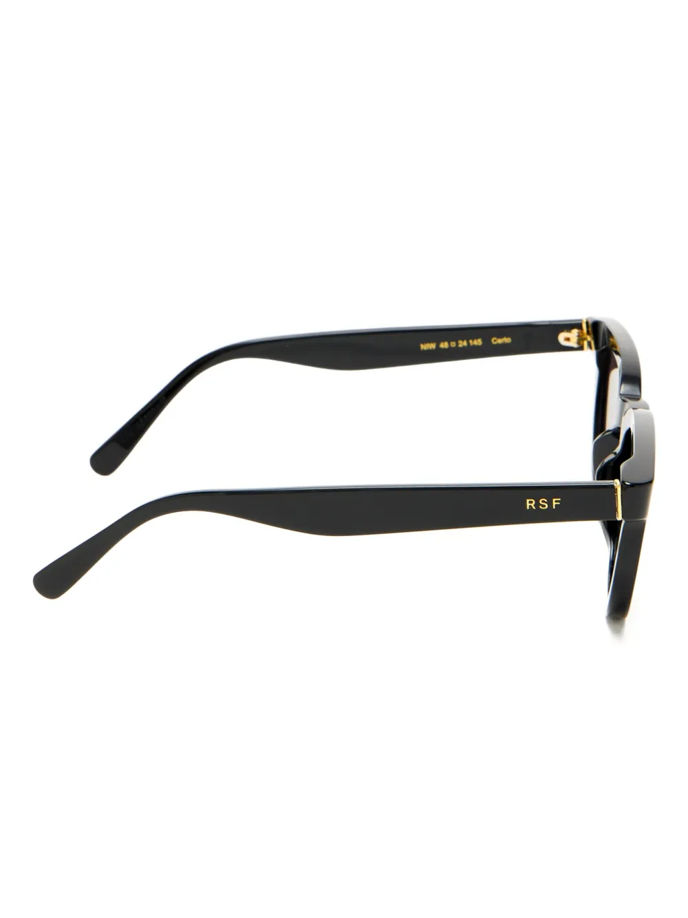 zwart vierkant montuur goudkleurige logodetails gekleurde glazen rechte pootjes Deze bril wordt verkocht met een beschermhoes.