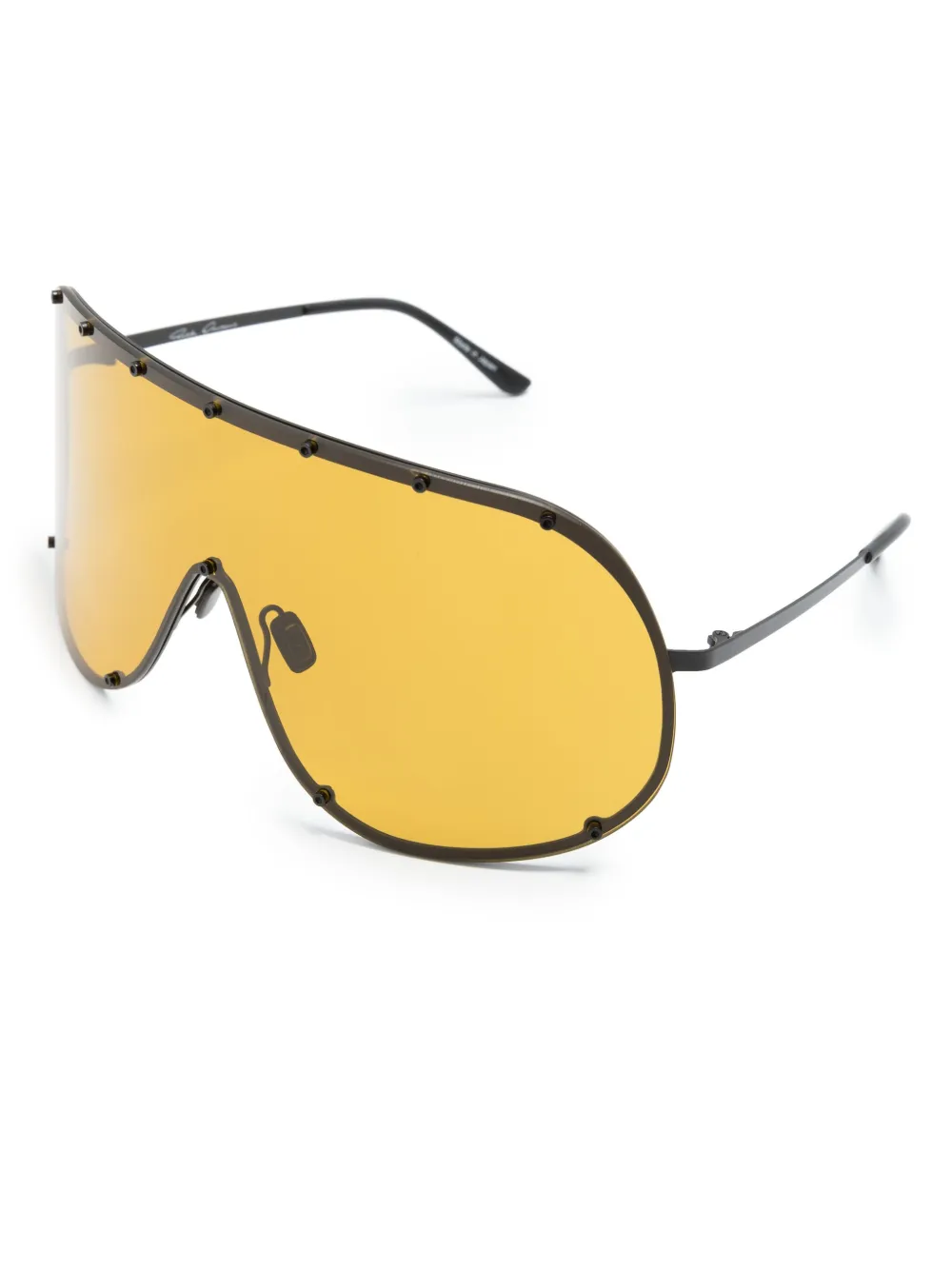 Zwart, roestvrij staal, oversized montuur, gele glazen, glazen met UV-bescherming, rechte pootjes en gebogen uiteinde. Deze bril wordt verkocht met een beschermhoes..