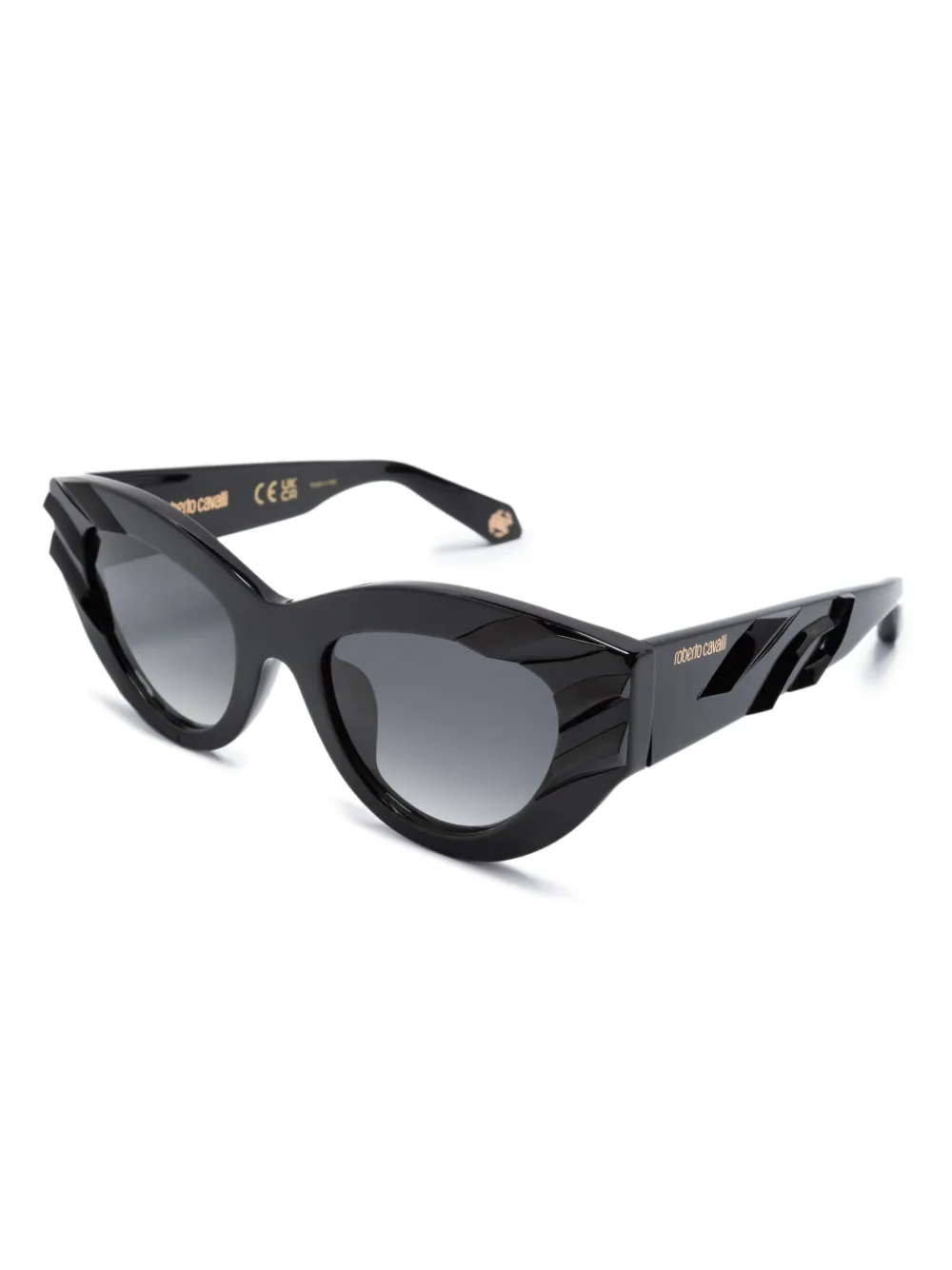 Zwart, acetaat, cat-eye montuur, grijze glazen, glazen met UV-bescherming, logoprint op het pootje, rechte pootjes en gebogen uiteinde. Deze bril wordt verkocht met een beschermhoes..