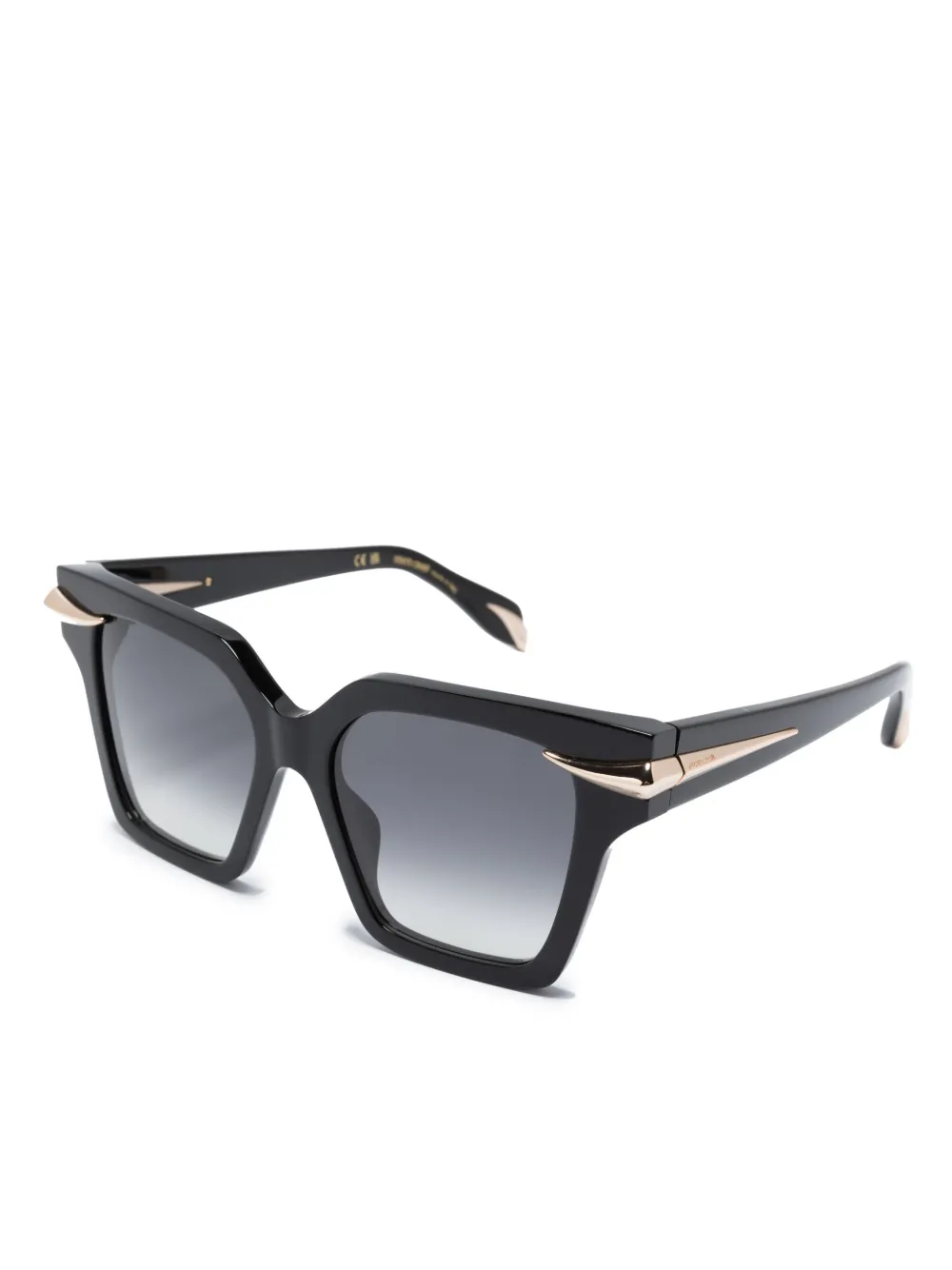 Zwart, acetaat, vierkant montuur, grijze glazen, glazen met kleurverloop, schildpad montuur, goudkleurig materiaal, rechte pootjes en gebogen uiteinde. Deze bril wordt verkocht met een beschermhoes..