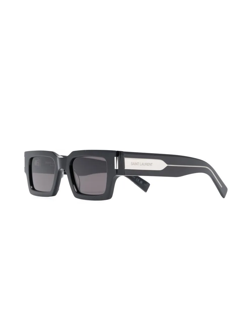Gitzwart, acetaat, vierkant montuur, gekleurde glazen, UV-bescherming, logoplakkaat op het pootje, rechte pootjes en gebogen uiteinde. Deze bril wordt verkocht met een beschermhoes..