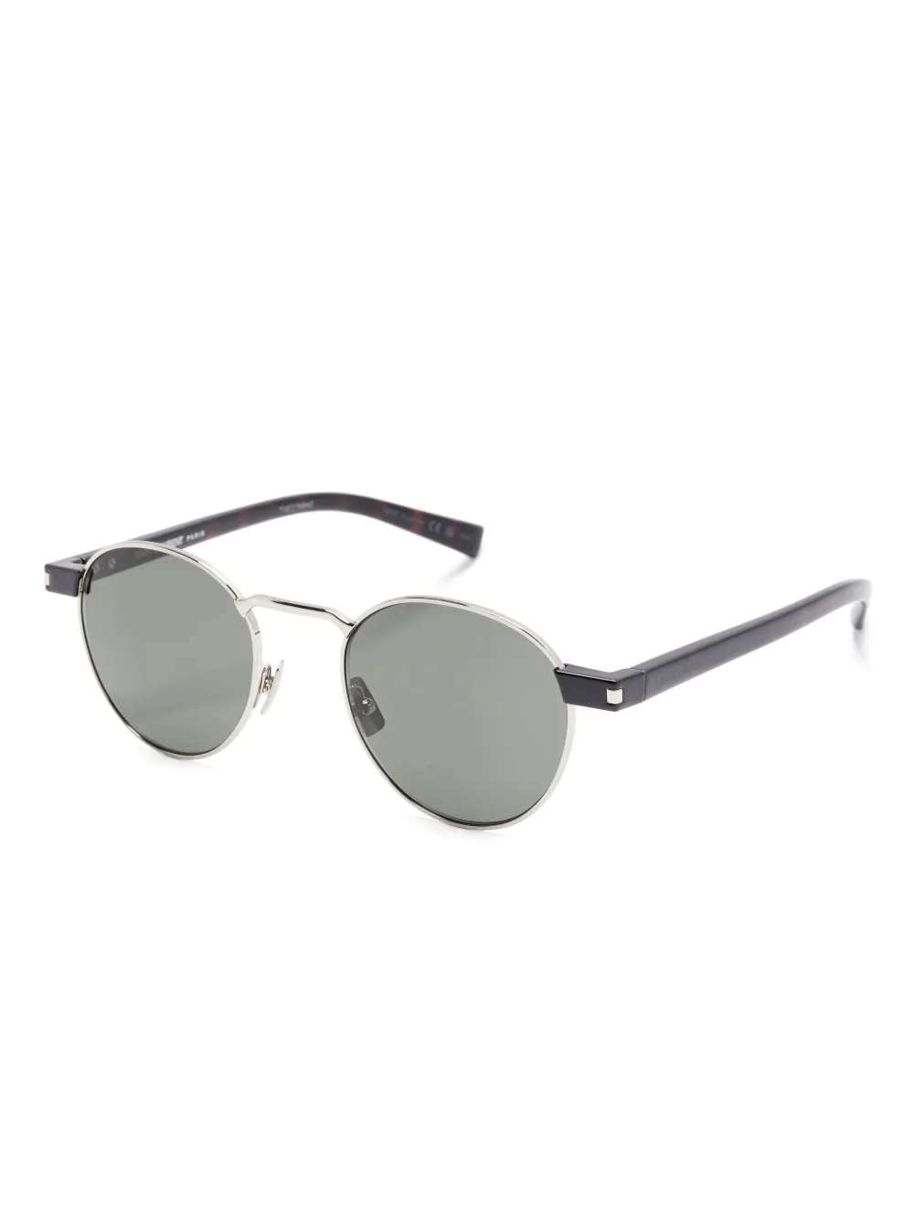 zwart rond montuur grijze glazen glazen met UV-bescherming pootje met gegraveerd logo rechte pootjes gebogen uiteinden neuskussentjes