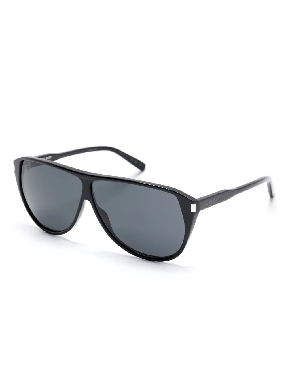 zwart oversized montuur grijze glazen glazen met UV-bescherming pootje met gegraveerd logo rechte pootjes gebogen uiteinden