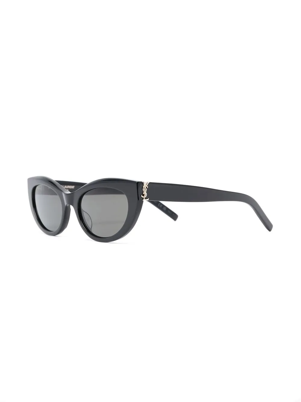 Zwart, cat-eye montuur, gekleurde glazen en kenmerkend YSL logoplakkaat.
