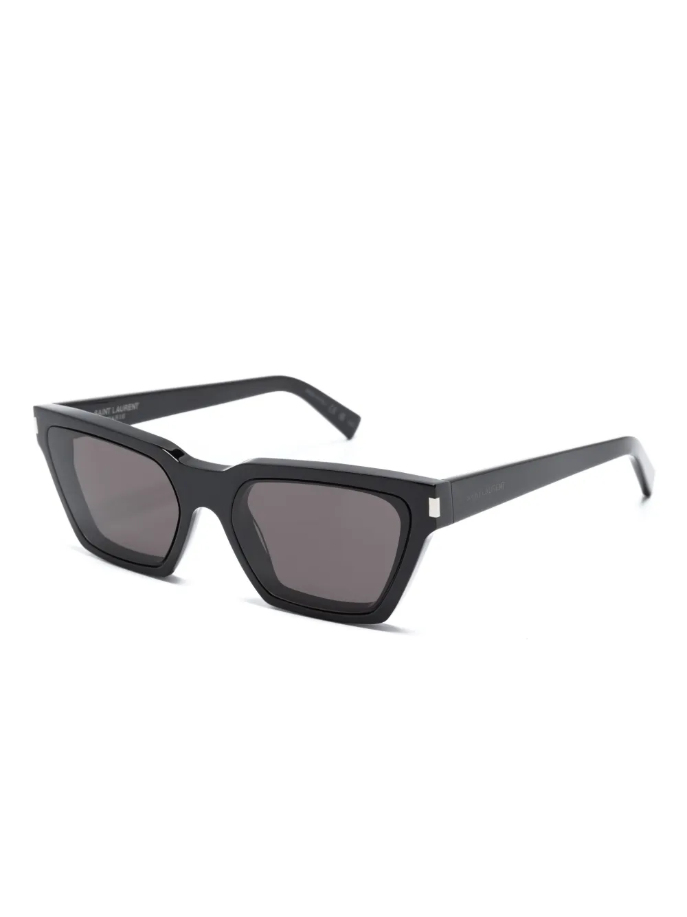 Zwart, acetaat, grijze glazen, cat-eye montuur, pootje met gegraveerd logo, rechte pootjes en gebogen uiteinde. Deze bril wordt verkocht met een beschermhoes..